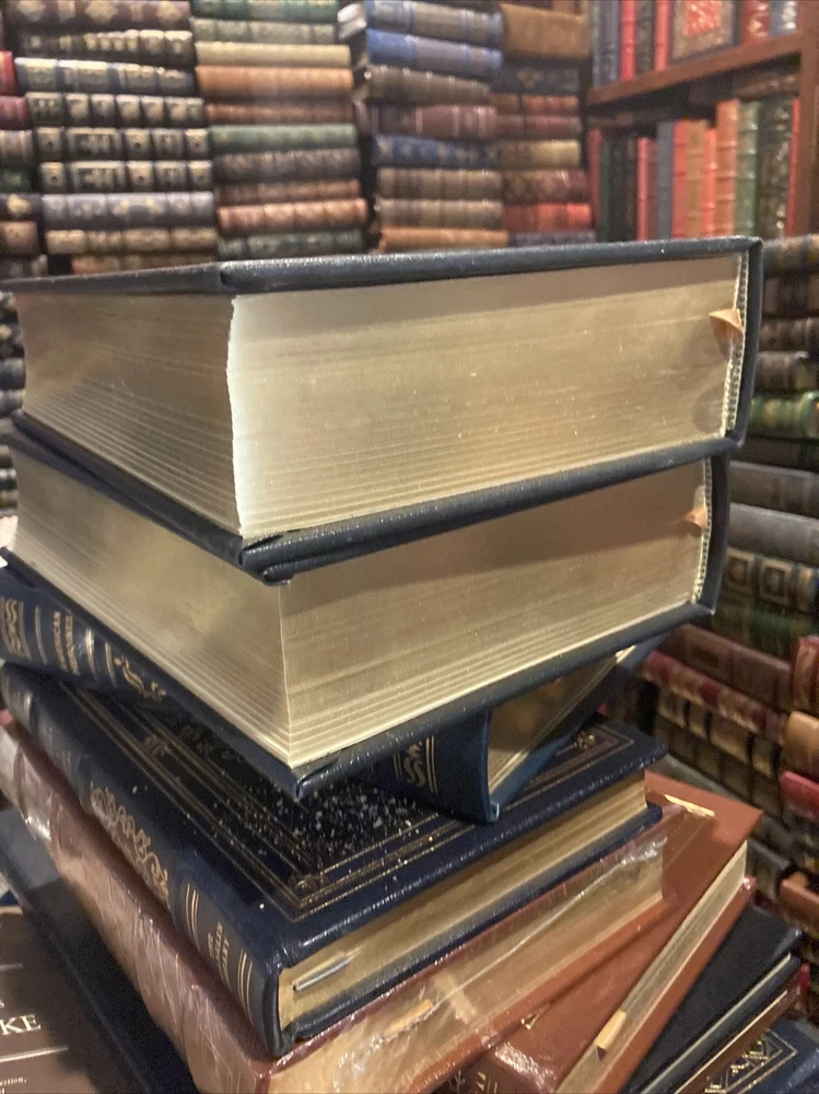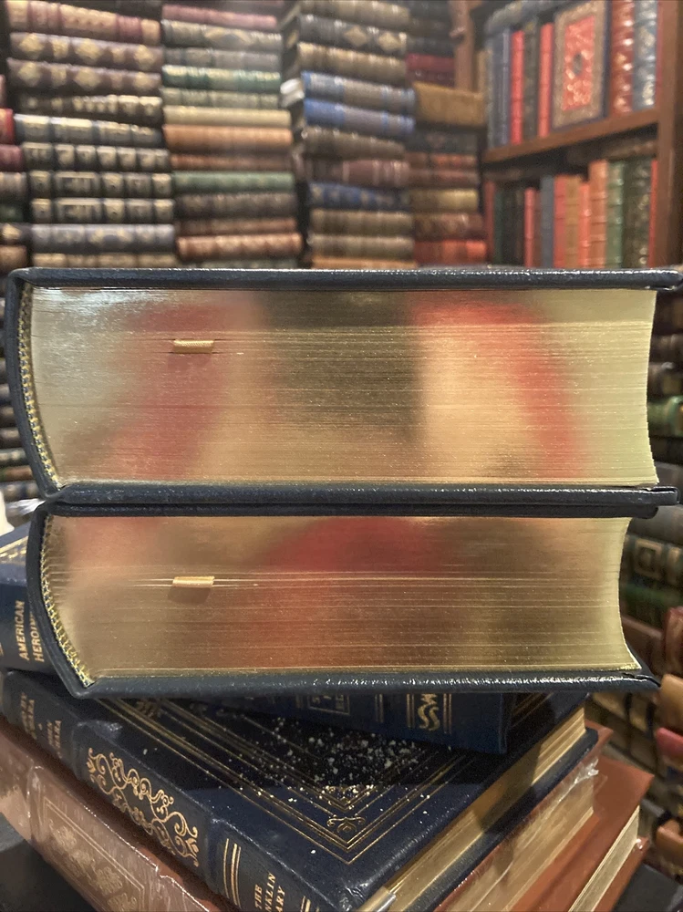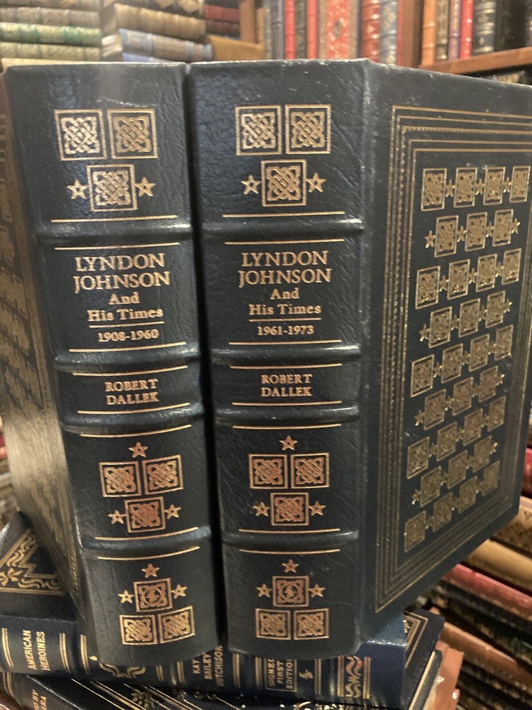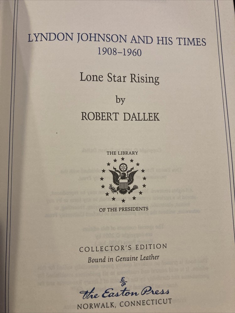 Easton Press leather edition of Robert Dallek's "Lyndon Johnson and His Times," COLLECTOR'S editions, two of the LIBRARY OF THE PRESIDENTS series, published in 2001. Bound in hunter green leather, the books have decorative paper end leaves, acid-free paper, a satin book marker, Symth-sewn binding, hubbed spine, gold gilding on three edges---in FINE condition. COLLECTOR'S NOTES included. Lyndon Baines Johnson, who lived from 1908-1973, was the 36th President of the U.S., 1963-1969. A Dominant figure in the U.S. Senate during the 1950s, he was, in Hubert Humphrey's words, "a genius in the art of the legislative process." Born in a small town near Stonewall, Texas, the Johnson were hewn from true pioneer stock. His family had been successful farmers and cattlemen in Texas for generations. His poor academic record in high school prevented him from being accepted at elite college, but LBJ was accepted and graduated from Southwest Texas State College, a small regional institution with seven hundred students, primarily from the German settlements near San Marcos. Johnson's first job at the college was picking up papers, rocks, and trash. However, the world of San Marcos accommodated his gifts. Johnson was 6 ft. 3" tall with a massive bone structure, and long, powerful limbs, dark brown hair, and a thick hairy chest. Although he had a long nose, enormous fleshly ears, and a leathery skin, he was very vain about his appearance and very proud of his manhood. He insisted that no likeness really did him justice. One one famous occasion, the painter Peter Hurd had spent weeks preparing a portrait of Johnson, only to hear the President declare, "That's the ugliest thing I've ever seen." When the world famous sculptor Jacques Lipchitz, prepared his likeness, Johnson observed, "Looks like I've been dead three weeks, and maybe I ought to be." Johnson loved southern cooking, and could consume large quantities of fried chicken, steak, or barbeque. Johnson like to relax every day with Cutty Sark scotch, and before his heart attack, he smoked three packs of cigarettes a day, but then gave up the habit under doctors' orders. Johnson's energy and stamina were phenomenal, and he always drove himself to the limit. In the White House, he began every day with a bedroom conference at 6:30 A.M. and then worked through until 2:00 in the afternoon. Johnson tried playing golf but the game bored him. As a young man, LBJ fell in love with CAROL DAVIS, but her wealthy father said that he would not allow his daughter to "marry into that no-account Johnson family." He later married CLAUDIA TAYLOR, known as Ladybird, and they were parents to two daughters. The Senator's intense drive and ambition, the hallmarks of his success, put a strain on his physical health, and in 1955, he suffered a massive heart attack. Johnson was a U.S. Representative and Senator, and was chosen as John F. Kennedy's Vice President in 1960. As President, Johnson learned the value of delegating responsibility, but he continued his relentless pursuit of power. In the wake of the launching of the Russian satellite Spitnik I, he became a champion of America's aggressive involvement in the space race. As Senator, he demonstrated a talent for wooing Southern colleagues and was very influential in winning passage of the CIVIL RIGHTS ACT of 1957. President Johnson became involved in the VIETNAM war and following great social unrest in the U.S., announced that he would not run for a second term. His GREAT SOCIETY program revolutionized the U.S. with his "war on poverty." When LBJ retired from the Presidency, he and Lady Bird moved back to the ranch at Stonewall, Texas, where they enjoyed the slower pace of life and the Texas "hill country." Volume one covers the years 1908-1960 and has pages 721, including an Epilogue, Notes and an Index. Volume two 754 pages, including an Index. I offer Combined shipping.