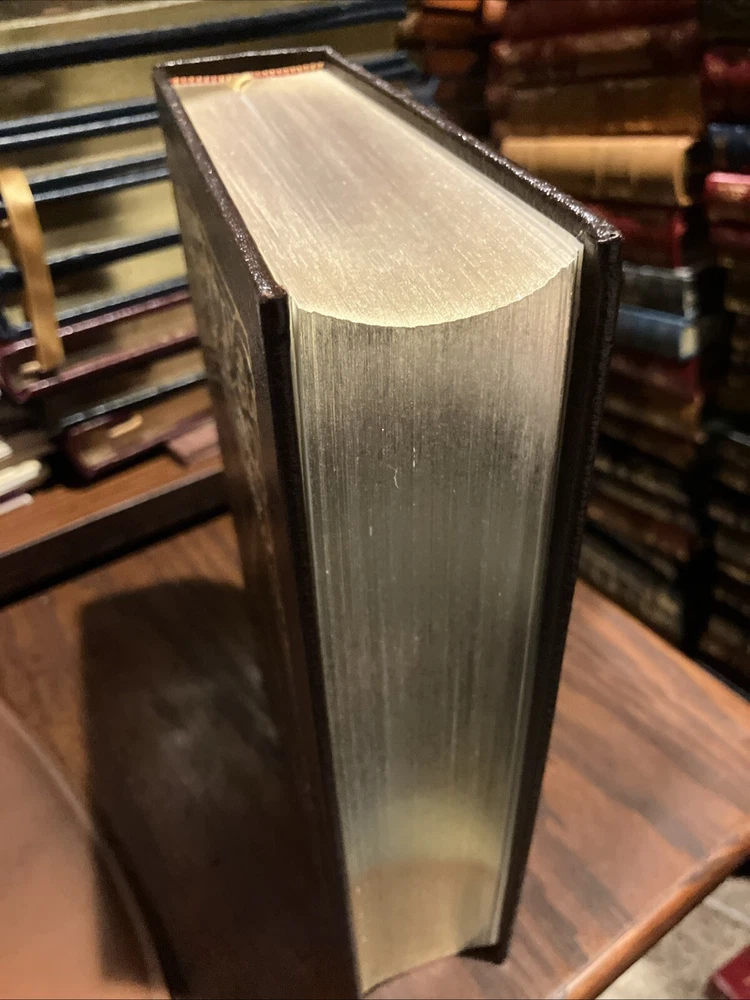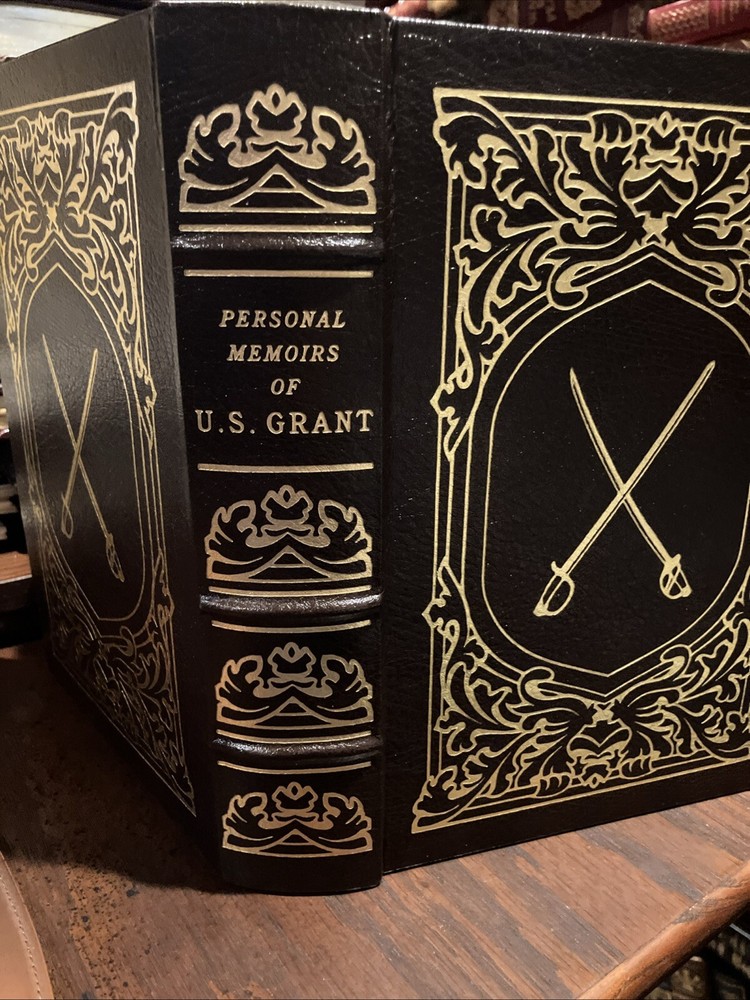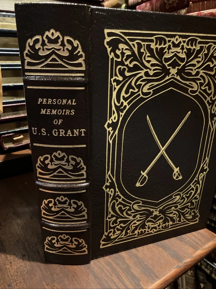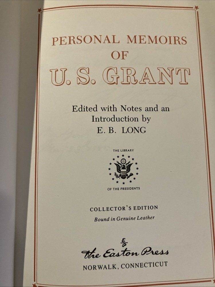 Easton Press leather edition of "Personal Memoirs of U.S." a Collector's edition, Edited with Notes and an Introduction by E.B. Long, one of the LIBRARY OF THE PRESIDENTS series, published in 1989. Bound in burgundy leather, the book has decorative paper end leaves, acid-free paper, Symth-sewn binding, a satin book marker, hubbed spine, gold gilding on three edges---in FINE condition---SHRINK WRAPPED. [Photos are from a personal copy.] Ulysses S. Grant, who lived from 1822-1885, was the 18th President of the U.S.,1869-1877. Thanks to Grant, the United States of America remained united after the Civil War threatened its future and thousands of lives had been lost. From a sickbed---literally weeks before his death--- Ulysses S. Grant recounted his life from birth to 1865. Grant was born to tanner Jesse Grant in Ohio. Jesse insisted his son attend the military academy at West Point where he graduated in 1843. He was assigned to Jefferson Barracks in St. Louis. Grant married JULIA DENT in 1848, and a day after their wedding, they left St. Louis on a leisurely journey down the Mississippi River and up the Ohio River to Louisville, Kentucky, where they visited some "wealthy Grant relatives." The Grants became parents to four children, including two sons: Frederick Dent and Jessie. Grant was a very private man and refused to allow his army men to see him naked when he was bathing---although he had a strong body, broad shoulders, a thick hairy chest---and a rugged handsome face. Until the Civil War, Grant's life was a litany of failures. Although a WEST POINT graduate and a veteran of the MEXICAN WAR, Grant botched his career in the peacetime army. Grant was morally opposed to the Mexican conflict. Shunted from one lonely outpost to another, he resigned his poorly paid commission to enter business----and rapidly went bankrupt. Virtually destitute, Grant borrowed money from his family to buy a tiny farm. For three years he struggled as a humble dirt farmer, often peddling firewood on a street corner in St. Louis. When the farm failed, Grant, nearing 40, begged jobs from friends. In 1861, when the first shots were fired on FORT SUMPTER, the man who would lead the Union Army to victory was a stock clerk in his brother's general store, the only job he could find. Then Destiny intervened: the CIVIL WAR exploded. His capture of Forts Henry and Donelson in early 1862 brought him to President Lincoln's attention and he was promoted to Major General. Shiloh, Vicksburg, Chattanooga, Appomattox. . .the victories rolled on. Robert E. Lee surrendered at Appomattox Courthouse in 1865. The major cloud over this historic occasion was the assassination of President Abraham Lincoln, whom Grant maintained "would have proven the best friend the South could have had." Lincoln's successor, ANDREW JOHNSON, was condemned as a duplicitous fool; Grant succeeded the impeached President Johnson in 1869. As President Grant was honest to a fault, but he unwittingly surrounded himself with dishonest appointees. He did reduce the national debt and negotiated favorable resolution of disputes with Great Britain. Despite BLACK FRIDAY. . . .the Credit Mobilier affair, the Whiskey Ring---scandal followed scandal---he left the Presidency as popular as the day he entered. Grant's memoir includes many insights on military preparedness, the roles of Federal and State governments, and the changing relationship between the U.S. and other world powers. Grant also predicted the outbreak of racial battles on city streets long after the abolition of slavery. 608 pages, including an index---a RARE title. I offer Combined shipping.