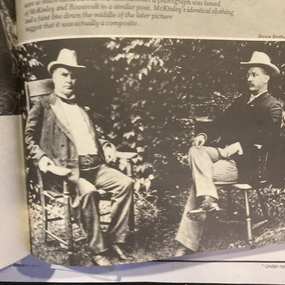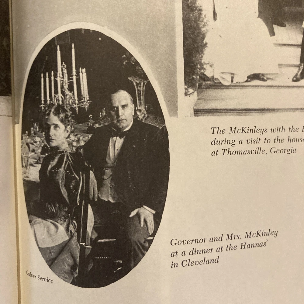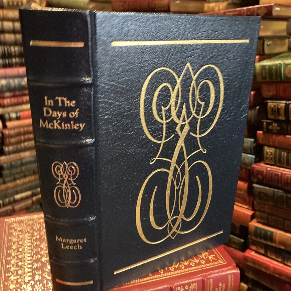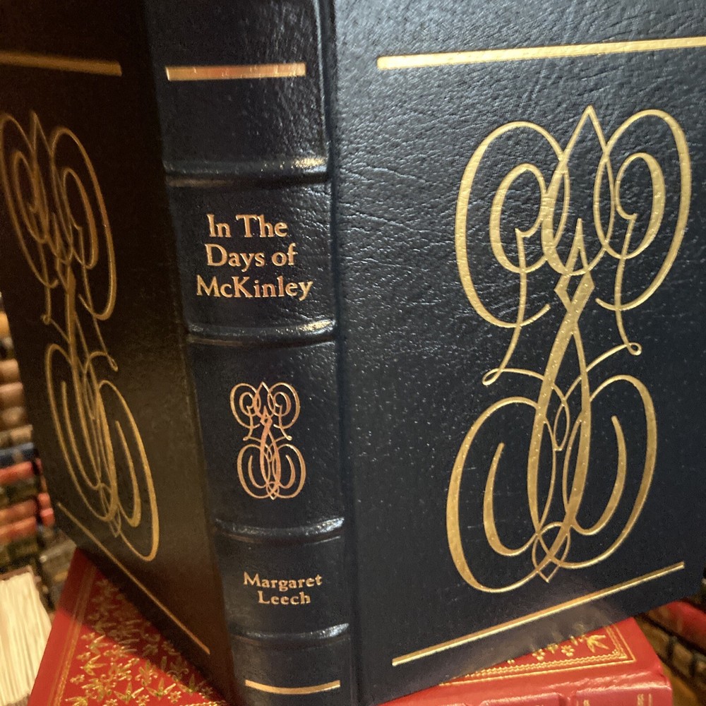 Easton Press leather edition of Margaret Leech's "In the Days of McKinley," a COLLECTOR'S edition, one of the LIBRARY OF THE PRESIDENTS series, published in 1986. Bound in deep hunter green leather, the book has decorative paper end leaves, acid-free paper, Symth-sewn binding, a satin book marker, gold gilding on top edge only---in FINE condition. William McKinley, who lived from 1842---1901, was born in Niles, Ohio, the seventh son of nine children. He attended Allegheny College in Pennsylvania. He fought with the Union Army and was on the bloody field at Antietam in Maryland. McKinley was described as a "handsome, bright, gallant boy" and at twenty-two had matured into vigorous manhood. McKinley left the army with an abiding hatred of war. He married IDA SAXTON to whom he was madly, devotedly in love. McKinley, a lawyer, became governor of Ohio at age forty-nine, and was elected to Congress, 1876-82, 1884-1890. McKinley was elected President and presided during the Spanish-American War. His presidency also saw the annexation of Hawaii and certain Samona Islands, intervention in China, and agitation for a Panama Canal. He was assassinated by anarchist, Leon Czolgosz in Buffalo, New York, at the Pan-American Exposition. Vice President THEODORE ROOSEVELT assumed the Presidency in 1901. 686 Pages. I offer combined shipping.