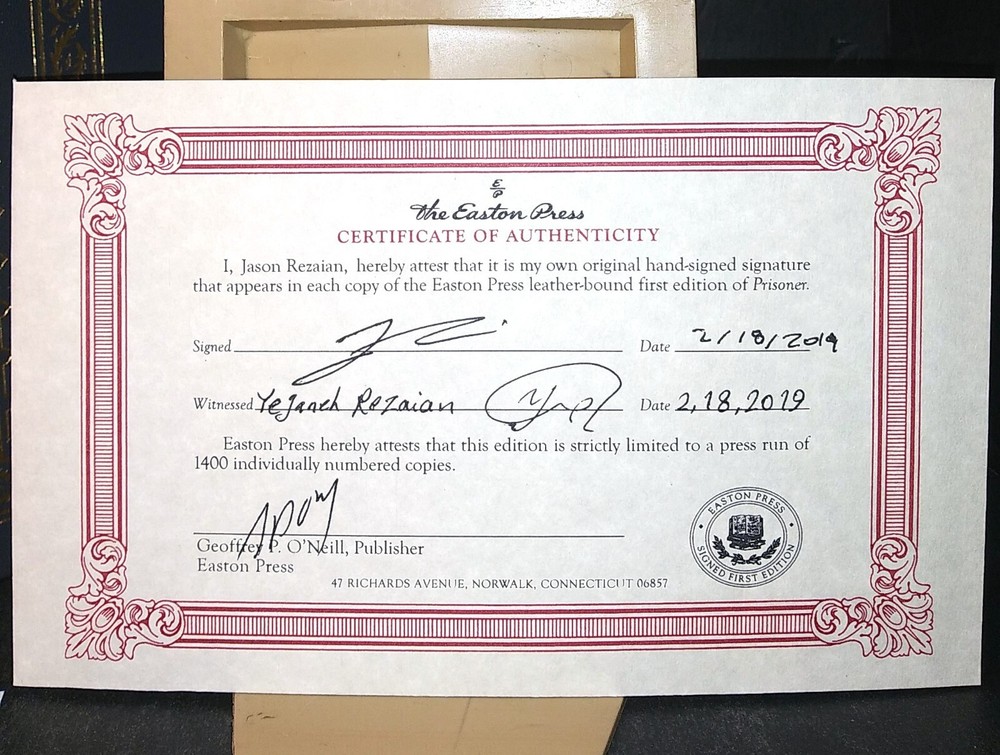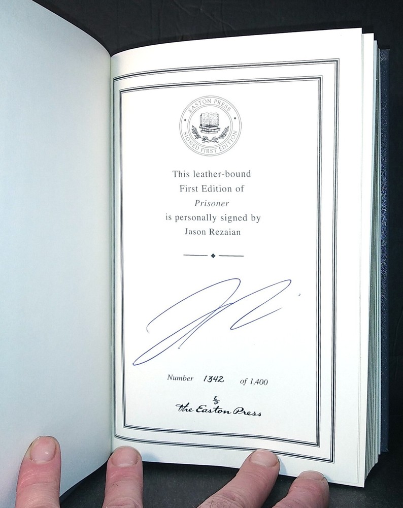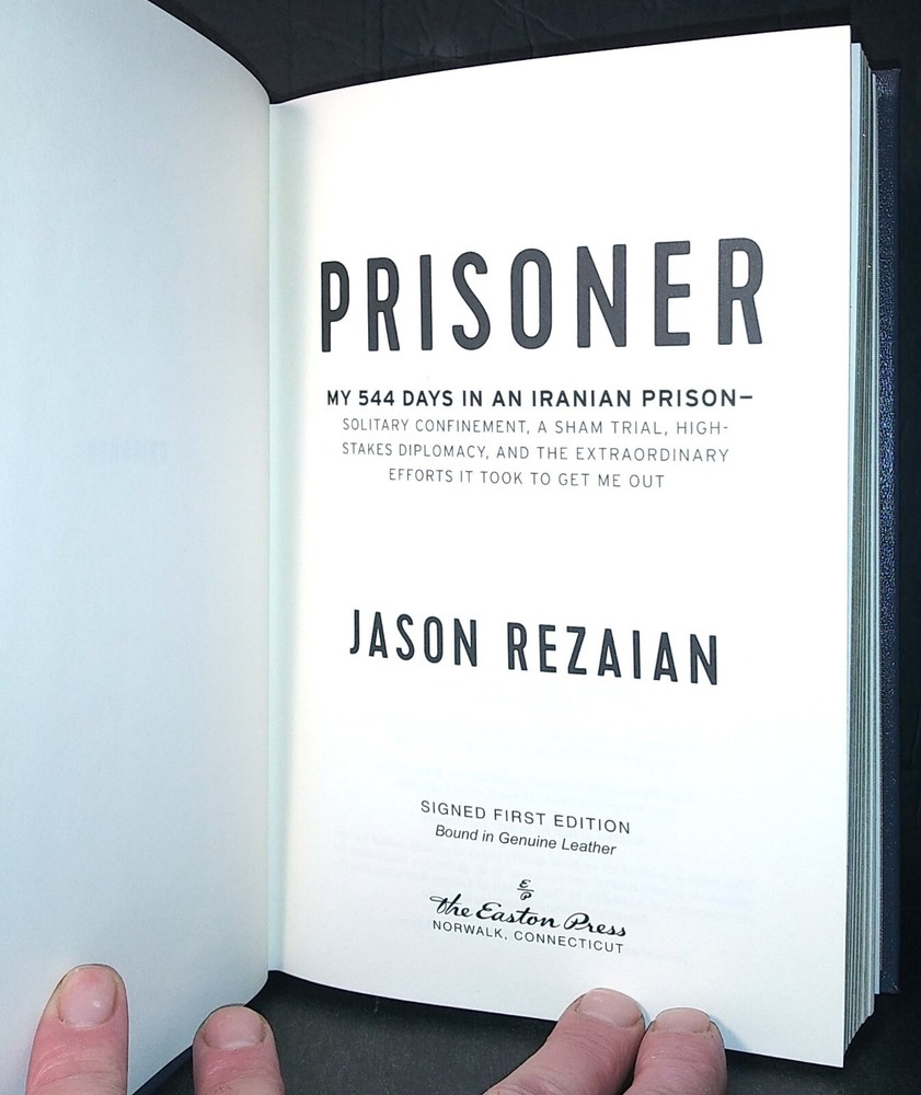 Easton Press: PRISONER - “My 544 Days in an Iranian Prison - Solitary Confinement, a Sham Trial, High Stakes Diplomacy and the Extraordinary Efforts it Took to Get Me Out” , by Jason Rezaian, (c) 2019 – SIGNED FIRST EDITION, LIMITED TO 1400 COPIES, with certificate of authenticity, unused bookplate and "A Note About the Book”. Like every EP book, it features: Premium Leather Silk Moire Endpapers Distinctive Cover Design Hubbed Spine, Accented in Real 22KT Gold Satin Ribbon Page Marker Gilded Page Edges Long-lasting, High-Quality Acid-neutral Paper Smyth-sewn Pages for Strength and Durability Beautiful Illustrations . Condition is NM ( appears to be unread, see photos for overall condition) . Please visit our store, we’re listing 100+ Easton Press books in the next couple of weeks. (Vintage, Limited Edition, Leather, Fine Binding, Collector’s Edition, Lit, Literature, Modern, Classic, Collection, Collecting, Memorabilia, Collectables) PLEASE READ BEFORE BIDDING: All items are very well-packed for shipment and always include tracking numbers. We are always happy to combine multiple items. WE NEVER USE STOCK PHOTOS - all images are of actual items. WE USE MULTIPLE IMAGES. We grade all items conservatively, and when grading record albums we follow the Goldmine Record Guide. Please see our other Ebay auctions for many used, odd, rare and collectible books and records, paper & ephemera, and more. Thank you! INTERNATIONAL BIDDERS - WE SHIP WORLDWIDE - if the cost isn't set in the listing, please contact me prior to bidding so I can determine Airmail shipping rates for you. CANADA - your shipping costs are cheaper than most other countries - please contact me for rates.
