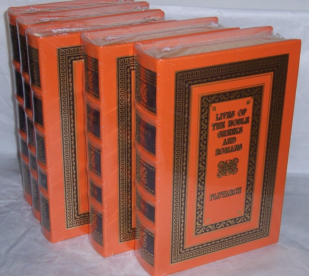 Deluxe Limited Edition Easton Press Plutarch's LIVES OF NOBLE GREEKS AND ROMANS in 5 vols The renowned work of classic biography, in the beautifully illustrated Grand Luxe edition of 1905 featuring the great poet John Dryden’s superb translation as revised and corrected by A.H. Clough...Plutarch’s Lives has been a standard work of history for millennia and has served as the historical source and inspiration for countless works including plays by Shakespeare, speeches by Patrick Henry and the writings of practically all of the Founding Fathers. For generations, Plutarch's Lives has stood as a vital component of any personal library. Features include: 1. Pixelle Natures Book text by Pixelle Specialty Solutions. 2. Lithography by Pulp Printhouse, Bristol, Tennessee. 3. Cowhide leather imported from Italy by Cortina leathers of New York. 4. With all the vintage illustrations from the 1905 Edition. 5. This edition is limited to 1200 hand-numbered sets. measured by 6" x 9 1/4" out-of-print, do not miss out this good deal Copyright by The Easton Press hubbed spine, bound in premium full leathers distinctive cover design, beautiful illustrations handsome, readable typefaces, permanent satin ribbon page marker elegant gilded page edges, endsheets of rich mabled pattern thread-sewn pages for durability and strength, long-lasting high quality, acid-neutral paper CONDITION DESCRIPTION: The books are in like new and unread condition: binding is tight, gold page edging still shiny, beautiful bright endleaves and satin ribbon page marker. It will make a great addition to any library. SHIPPING / HANDLING: Book(s) will be handled/packed very safely, and shipped via USPS media mail with delivery confirmation.