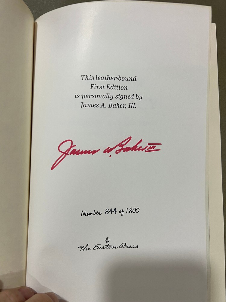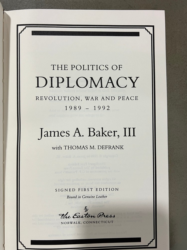 Politics of Diplomacy - James Baker SIGNED Easton Press 1st Editions Excellent Condition! New Books get listed daily !!! 100s of Easton Press and Franklin Library books available!! All books get cleaned with a leather cleaner to remove any dust, odor and restore the beauty of leather!! Combined Shipping Discount: USA buyers - every book $1 off International combined shipping: 1 or 2 books - $45 3 or 4 books - $75 5 + books $17 per book 10+ books $13 per book WE SHIP DAILY!! RETURNS: Hassle-Free 30-days return policy and we pay for a return !! Check our Inventory (Link to eBay Store): http://stores.ebay.com/EastonFranklinBooks