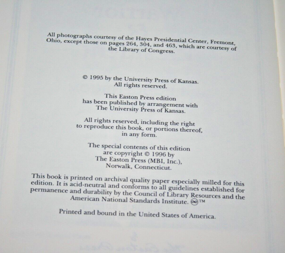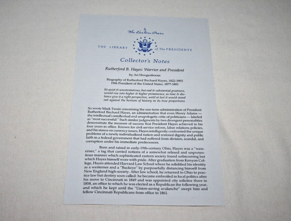 From the Easton Press Library of the Presidents Collector's Edition Series... Rutherford B. Hayes Warrior & President by Ari Hoogenboom Copyright 1996 by The Easton Press Bound in Premium Full Leather This volume contains all of the classic Easton Press trimmings: Premium Leather Decorated Endleaves Distinctive Cover Design Hubbed Spine, Accented in Real 22KT Gold Satin Ribbon Page Marker Gilded Page Edges Long-lasting, High Quality Acid-neutral Paper Smyth-sewn Pages for Strength and Durability A very scarce title in any condition, this copy is in Absolute Mint and Unread condition. The front and back covers are both in Perfect condition and the gilded page edges show no wear at all! There are no writing, markings, bookplates, or other signs of prior ownership in this book. The binding is tight and square without spine lean. This book is part of the Library of Presidents published by Easton Press and comes complete with a Collector's Notes. It would be a beautiful addition to your Easton Press collection. This book is very elusive in this superior condition, as only a limited number of them were ever published, so now is the time to act. Hopefully you can add this book to your collection and enjoy it in the years to come... Please Email Me With Any Questions You Might Have! Shipping Info: Buyer to Pay Shipping and Handling International Bidders Pay Extra Shipping Forms of Payment Accepted: Paypal Good luck and happy bidding! Powered by eBay Turbo Lister The free listing tool. List your items fast and easy and manage your active items.