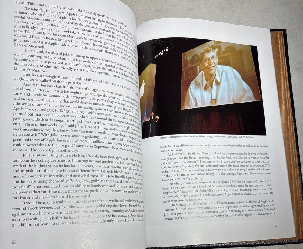 This luxurious hardcover edition of Time Magazine's "Steve Jobs: Genius who Changed Our World" is a must-have for any collector or enthusiast of business and technology history. Featuring beautiful leather binding and 22kt gold accents on the hubbed spines, this book is a true work of art. With multiple authors and contributors, this nonfiction narrative offers a comprehensive look at the life and career of the legendary Steve Jobs. Published in 2011 by Easton Press, this collector's edition is complete with a slipcase and illustrated with archival-quality acid-neutral paper. Perfect for anyone interested in American history, cultural history, or computing, this book is a valuable addition to any library.