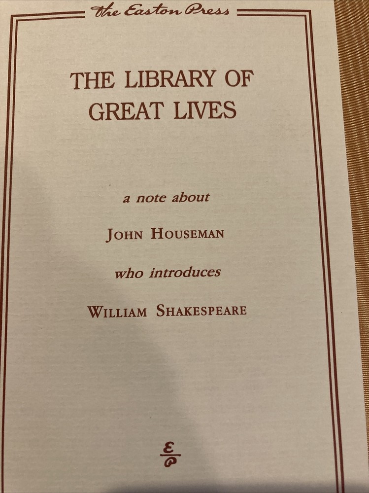 Easton Press leather edition Marchette Chute's "Shakespeare of London," a COLLECTOR'S edition, With a Foreword by JOHN HOUSEMAN, one LIBRARY OF GREAT LIVES series, published between 1988. Bound in burgundy, the book has camel tan moire silk end leaves, Symth-sewn binding, acid-free paper, a satin book marker, hubbed spine, gold gilding on three edges---in near FINE condition---except for 'very minor' imperfection to gilt---mentioned for accuracy. William Shakespeare, who lived from 1564 – 1616, was an English poet, playwright, and actor, widely regarded as the greatest writer in the English language and the world's greatest dramatist. He is often called England's national poet and the "Bard of Avon." In the Foreword, Houseman wrote: "Theatre is generally recognized as the highest manifestation of human culture; it is also the most ephemeral. Chute wrote: "In dealing with Shakespeare's life, I have taken what seems to me the safest course and have based it entirely on contemporary documents." Shakespeare wrote some 39 plays, 154 sonnets, and two long narrative poems. His plays have been translated into every major living language and are performed more often than those of any other playwright. Shakespeare was born and raised in Stratford-upon-Avon, Warwickshire. At the age of 18, he married Anne Hathaway, with whom he had three children: Susanna and twins Hamnet and Judith. Sometime between 1585 and 1592, he began a successful career in London as an actor, writer, and part-owner of a playing company called the Lord Chamberlain's Men. Outside of Shakespeare's plays, the King's Men presented Ben Jonson's excellent comedy, "The Alchemist." At age 49---around 1613--- he appears to have retired to Stratford, where he died three years later. John Houseman, who lived from 1902-1988, was a unique figure in the 20th century history of the dramatic arts; he was a majestic actor and director. Houseman was a professor at Vassar, Bernard, and University of California. 395 pages, including a Selected Bibliography and an index. Combined shipping is available.