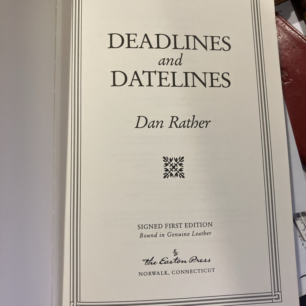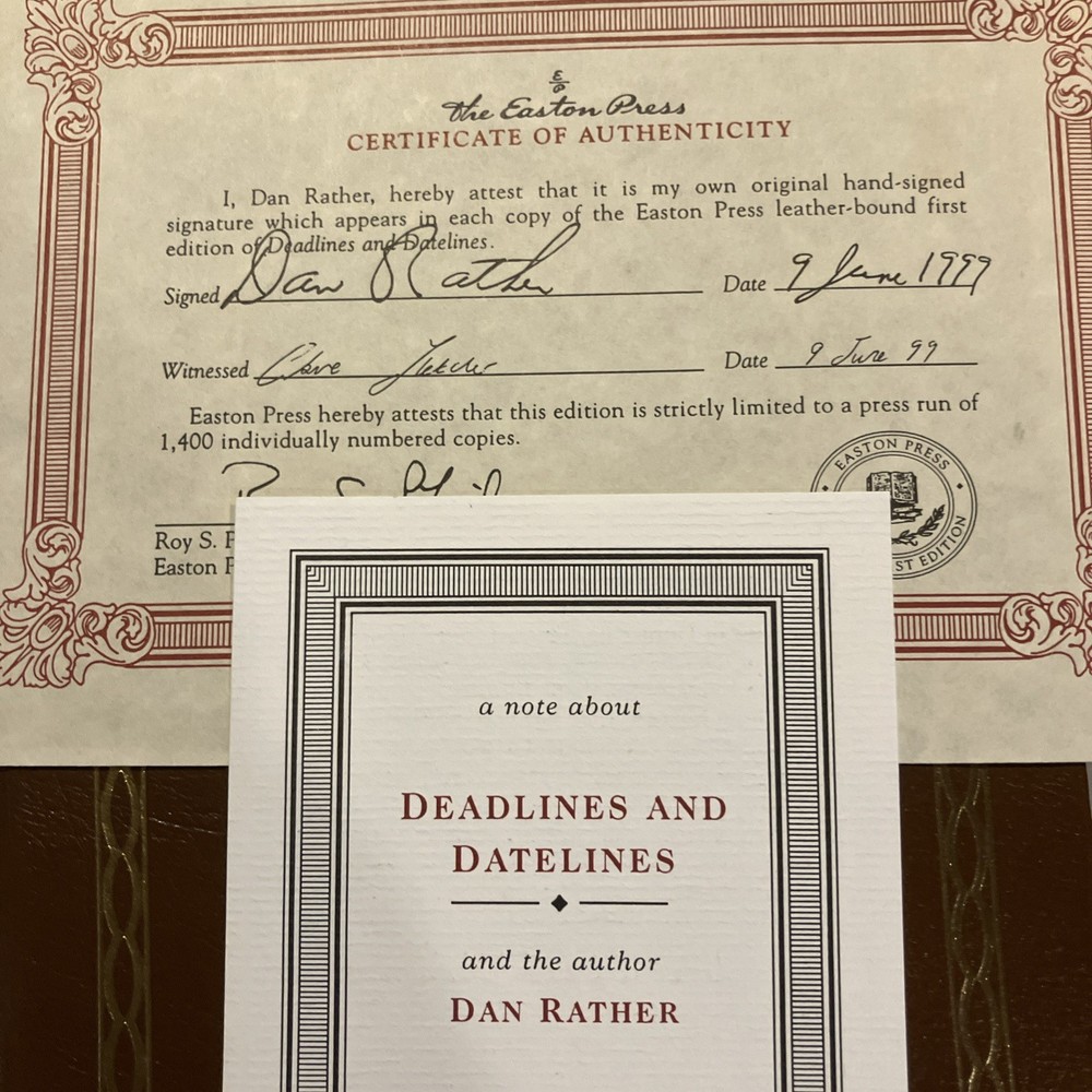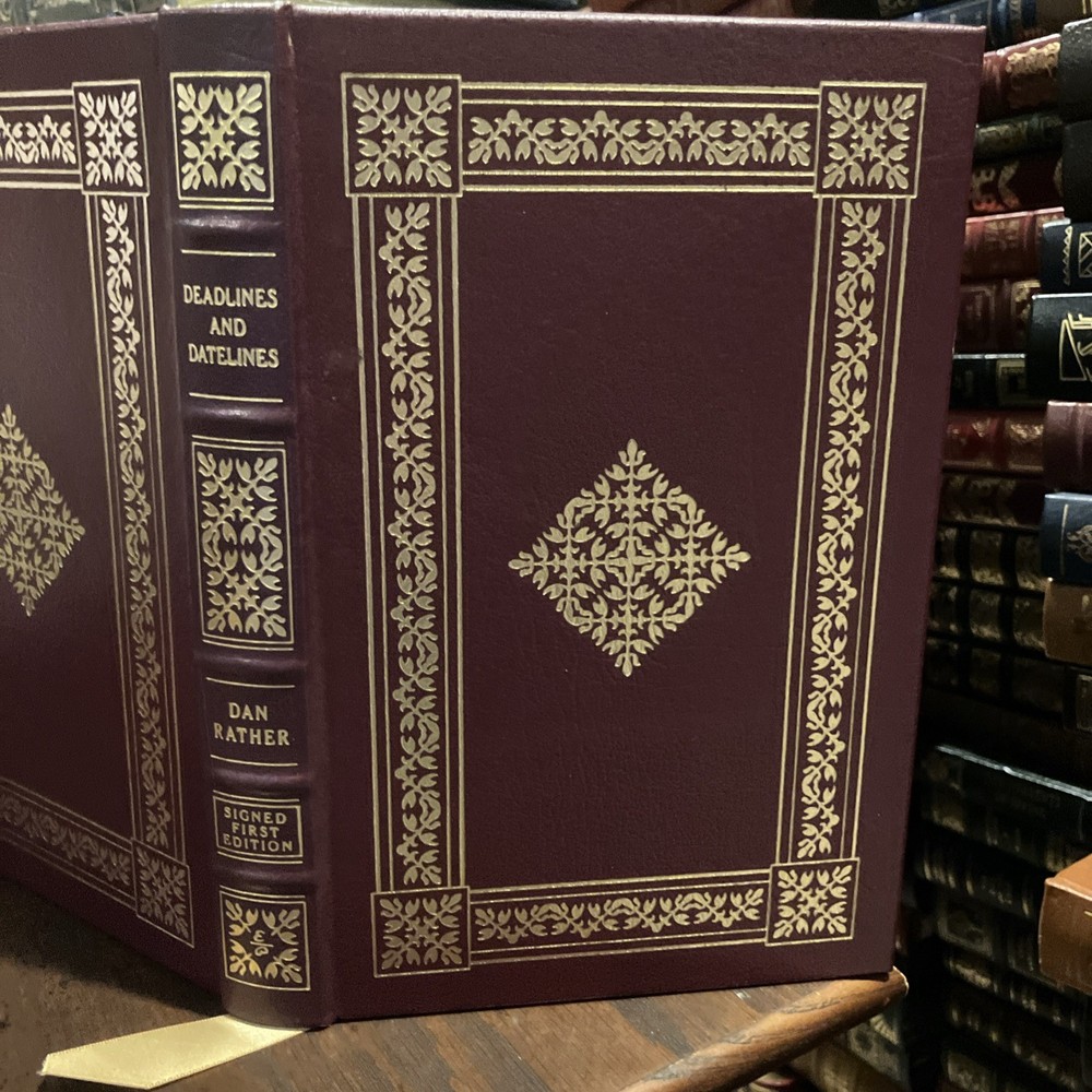 Easton Press leather edition Dan Rather's "Deadline and Datelines," Certificate of Authenticity numbered 517 out of 1400, one of the SIGNED FIRST EDITION series, PERSONALLY SIGNED by DAN RATHER, published in 1999. Bound in brown leather, the book has camel tan moire silk end leaves, acid-free paper, Symth-sewn binding, a satin bookmarker, hubbed spine, gold gilding on three edges--- in near FINE condition---except for 'foxing' on fore edge. Dan Irvin Rather, Jr. was born in 1931, the son of a Texas ditch digger "who worked with his hands and his heart." His dad never finished high school but was a voracious reader, especially newspapers. In 1950, Rather, a nineteen-year-old Texan, got his first break when he was hired as a reporter in Huntsville, Texas. Rather was married to Jean who grew up Winchester, Texas, and they are parents to four children. He is an American journalist, commentator, and former national evening news anchor. During HURRICANE CARLA in 1961, his reporting saved thousands of lives with the successful evacuation of 350,000 people. Rather later broadcast the fall of the Berlin Wall, the Gulf War, 9/11, the Iraq War and the war on terror. He famously reported from Dallas in November 1963 when President John F. Kennedy was assassinated. He was promoted by CBS NEWS, where he served as the White House Correspondent beginning in 1964. This volume covers the years from 1997 forward. Rather comments on President BILL CLINTON, MALCOLM X, TIMOTHY McVEIGH, WANG DAN about TIANANMEN SQUARE in CHINA; YANG GUO FUNG in Hong Kong; Vice President AL GORE, AUDREY HEPBURN, JERRY CLOWER, the JONESBORO, ARKANSAS, school shooting in 1998, TEXAS GOVERNOR and later President of the U.S.: GEORGE W. BUSH, the death of PRINCESS DIANA in ENGLAND; Iraqi President SADDAM HUSSEIN. He served as foreign correspondent in London and Vietnam. He later covered the presidency of Richard Nixon, including Nixon's trip to China, the Watergate scandal, and the president's resignation in 1981. Rather wrote: For American Presidents, August is the "cruelest month." President and Mrs. John Kennedy lost a newborn in 1963; Lyndon Johnson's dreams of reversing his decision to drop out of the race for another term died with the Soviet invasion of Czechoslovakia in August 1968. Richard Nixon was forced to resign in August, 1974. Bill Clinton was forced to become the first President in history to testify before a grand jury in a criminal case, but only the "most virulent Clinton-haters wanted him to leave office." Kenneth Starr despised Clinton; by August 1998, "the White House was in disarray, distrust and dismay." Rather anchored the CBS EVENING NEWS for 24 years until he was fired in 2007. Rather filed a $70 million lawsuit against CBS but the case was dismissed in 2010. Since 2018, Rather has been broadcasting on You Tube. "Deadlines and Datelines" displays Rather's distinctive gift for getting to the heart of the events and personalities that have formed our time." 220 pages. I offer combined shipping.