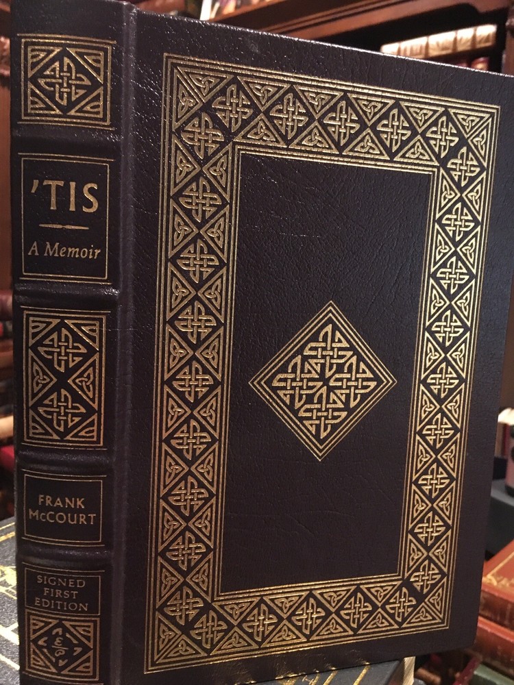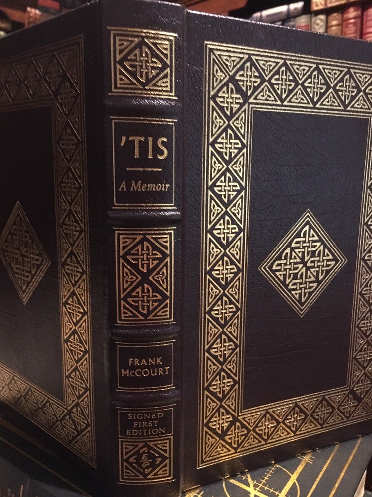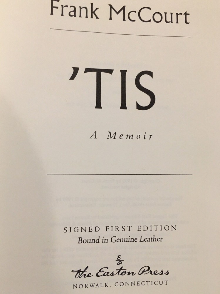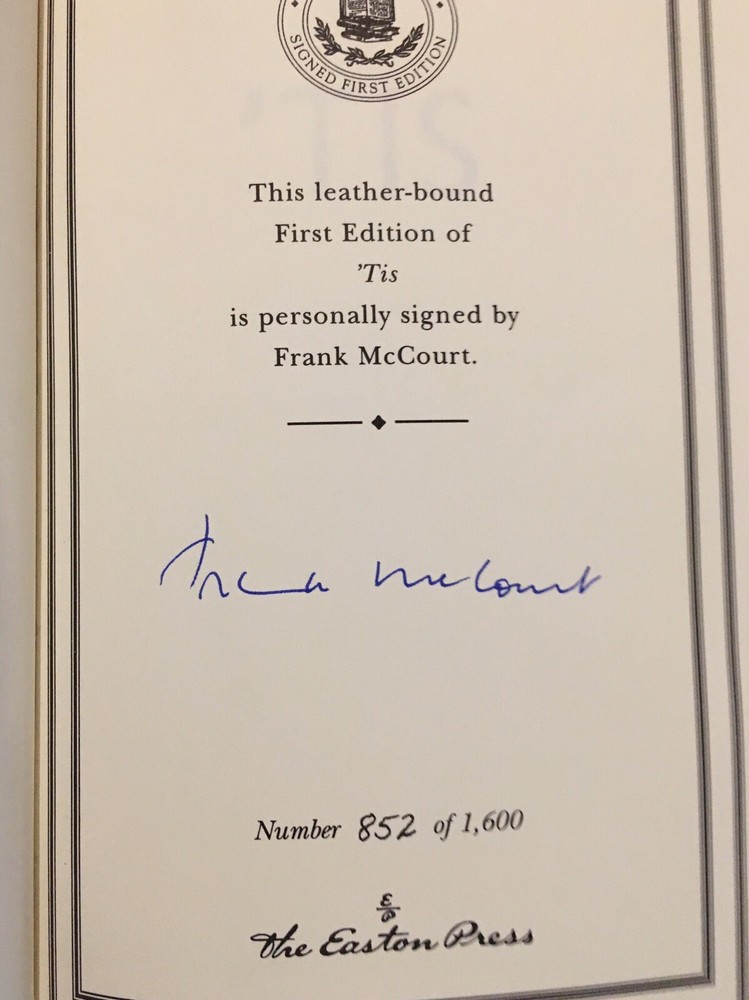 Easton Press leather edition of Frank McCourt's "Tis: A Memoir," a SIGNED FIRST EDITION, Personally signed by FRANK McCOURT, one of 1600 copies, published in 1999. Bound in hunter green leather, the book has camel tan French moire silk end leaves, hubbed spine, acid-free paper, satin book marker, Symth-sewn binding, gold gilding on three edge--in FINE condition. Frank McCourt, who lived from 1930---2009, was born in the U.S. but his family could not succeed financially and shamefully returned to Limerick, Ireland. McCourt wrote: "When I look back on my childhood I wonder how I survived it all"---so opens the 1996 autobiography ANGELA'S ASHES, the first book by a previously unknown 66-year-old New York City high school English teacher. "Angela's Ashes" describes McCourt's youth in slums of LIMERICK, IRELAND, a life of poverty, deprivation, disease and death dominated by brutal schoolmasters and priests, a charming but alcoholic father, and a loving but depressed mother, Angela. "Tis" answers young Frank, returning to the country of his hopes. McCourt wrote: "When you are Irish and you don't know a soul in New York and you're walking along Third Avenue with trains rattling along on the El above there's great comfort in discovering there's hardly a block without an Irish bar: Costello's, the Blarney Stone, the Blarney Rose, P.J. Clarke's, the Breffni, the Leitrim House, the Sligo House, Shannon's. Ireland's Thirty-two, the All Ireland. I had my first pint in Limerick the day before I turned sixteen and it made me sick and my father nearly destroyed the family and himself with the drink, but I'm lonely in New York, and lured in by Bing Crosby on jukeboxes singing "Galway Bay" and blinking green shamrocks the likes of which you'd never see in Ireland. McCourt describes being sent to Camp Kilmer in New Jersey, his experiences in Hamburg, Germany and later in Stuttgart during WW II. In Germany, he writes: "Sometimes I think I'd be the best Catholic in the world if they'd only do away with priests and let me talk to God there in the bed." McCourt describes his return to Belfast and Dublin to visit his grandmother. Entering college on the GI bill, McCourt is allowed to only take two courses at first at NYU. College is fascinating to McCourt, who writes: "When I'm discovering Sean O'Casey, Lady Gregory, or Yeats, I have to look them up in the Encyclopedia Britannica to learn how the famous Irish writers were. The second memoir, chronicles his struggles and triumphs as a penniless high-school drop-out from Ireland pursuing the elusive American dream. McCourt describes his poorly educated high school English students, their struggles, their triumphs, their failures, and his joy in teaching. McCourt's English students do not want to read GIANTS IN THE EARTH and SILAS MARNER, standard required reading in the 1950s, but they do enjoy having "Mr. McCoy" tell them stories about Ireland and some of the girls think "he's cute!" 367 pages. I offer Combined shipping.