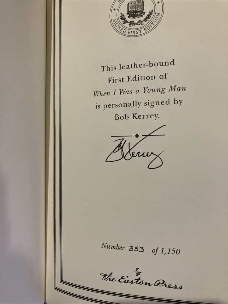 Easton Press leather edition of Bob Kerrey's "When I Was a Young Man: A Memoir," one of the SIGNED FIRST EDITION series, Limited to 1,150 copies, this one numbered 363, a COLLECTOR'S edition, published in 2002. Bound in green l eather, the book has camel tan French moire end leaves, satin book marker, hubbed spine, acid-free paper, Symth-sewn binding, gold gilding on three edges---in FINE condition. Joseph Robert Kerrey was born in 1943 and served as the 35th governor of Nebraska from 1983-1987 and as a U.S. Senator from 1989--2001. Before entering politics, he graduated with a degree in pharmacy from the University of Nebraska. Kerrey served in Vietnam as a U.S. Navy Seal officer. He was severely wounded and lost part of his leg; he was awarded the Congressional Medal of Honor for bravery in combat. He later faced controversy for being the commanding officer during the Thanh Phong raid, where numerous civilians were killed. Kerrey was a candidate for president of the U.S. in 1992. He retired from the Senate in 2000. In 2012 Kerrey sought election to his old Senate seat in but was defeated. Kerrey recounts the experiences that shaped his life while growing up in Lincoln, Nebraska, a safe and provincial world of Saturday afternoon cowboy serials and Sunday school bible stories, and making celebrities of Billy Graham, Bishop Sheen, and Norman Vincent Peale. Kerrey's memoir describes a classic mid-American childhood where he was one of seven children. Kerrey was small and struggled to compete in sports like his older brother---although he did make the high school football team. But Vietnam was another world. After witnessing, suffering, and participating in war, Kerrey didn't just have to learn how to walk without a leg---he had to learn to be honest about himself and his country. Candid, direct and eloquent, "When I Was Young" is the powerful tale of a man and nation coming of age. 270 pages. I offer combined shipping.