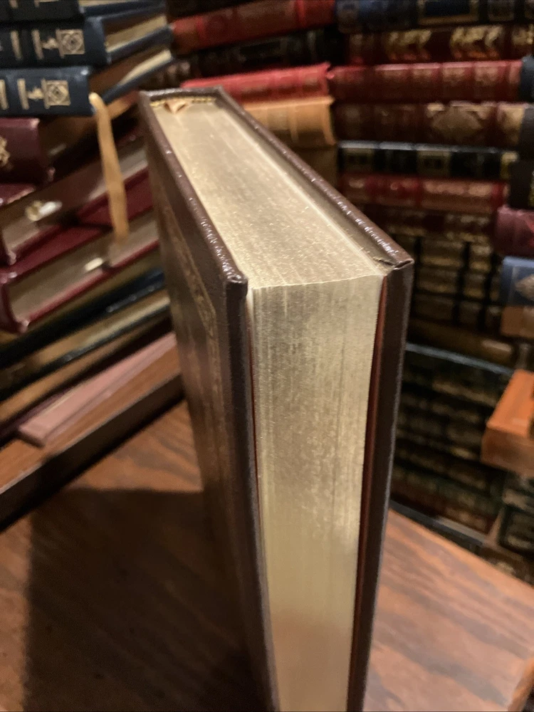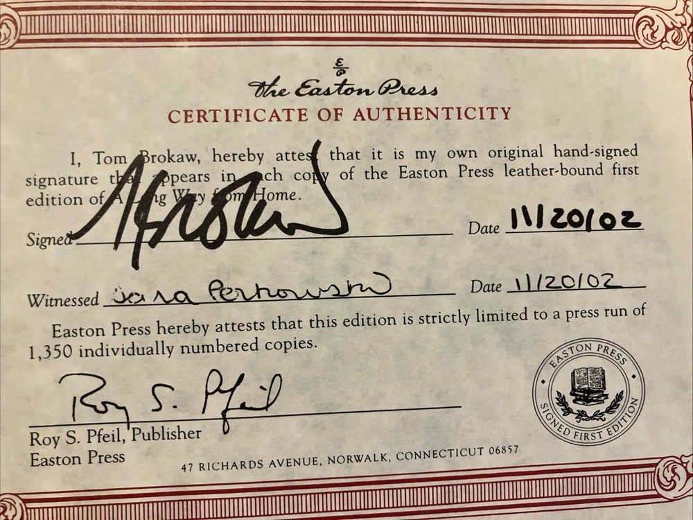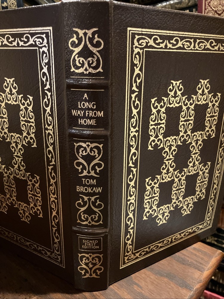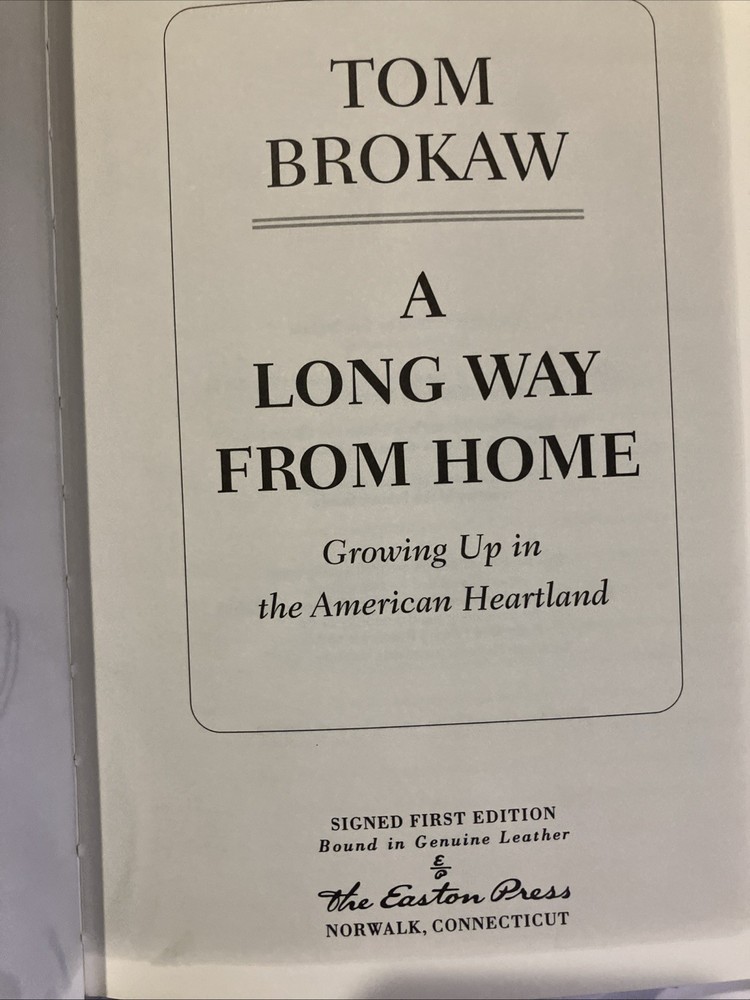 Easton Press leather edition Tom Brokaw's "A Long Way From Home: Growing Up in the American Heartland," Certificate of Authenticity numbered 495 out of 1350, one of the SIGNED FIRST EDITION series, PERSONALLY SIGNED by TOM BROKAW, Illustrated with Period Photographs, published in 2002. Bound in brown leather, the book has camel tan moire silk end leaves, acid-free paper, Symth-sewn binding, a satin bookmarker, hubbed spine, gold gilding on three edges--- in FINE condition. Thomas John Brokaw, who was born in 1940, is an American retired network journalist and author. He first served as the co-anchor of The TODAY SHOW from 1976 to 1981 with JANE PAULEY , then as the anchor and managing editor of NBC Nightly News for 22 years (1982–2004). At this position he was one of the "Big Three anchors" along with DAN RATHER and PETER JENNINGS. Brokaw showcases his South Dakota boyhood and family history, growing up during the post-World War II years. I lived the "idyllic life of a fifties teenager. Evenings, our family's appointment with CHET HUNTLEY and DAVID BRINKLEY was for me a magical experience. Television was a godsend to those of us in remote areas." Brokaw played baseball, basketball and was the 'back up' quarterback on his high school team. He attended Iowa University for a year but did poorly. He then transferred to the University of South Dakota where he earned a degree in Political Science. He married his high school sweetheart, MEREDITH AULD----MISS SOUTH DAKOTA--- and they are the parents of daughters Jennifer, Andrea and Sarah. Brokaw wrote that "when John F. Kennedy was assassinated during my first year in a newsroom, my naivete was shattered, and for the next forty years I have been a traveler on a landscape of great, wrenching change." Brokaw has been the recipient of numerous awards and honors including the Presidential Medal of Freedom, which was awarded to him by President BARACK OBAMA in 2014. Brokaw lives in New York and Montana. 233 pages, including an index. I offer Combined shipping.