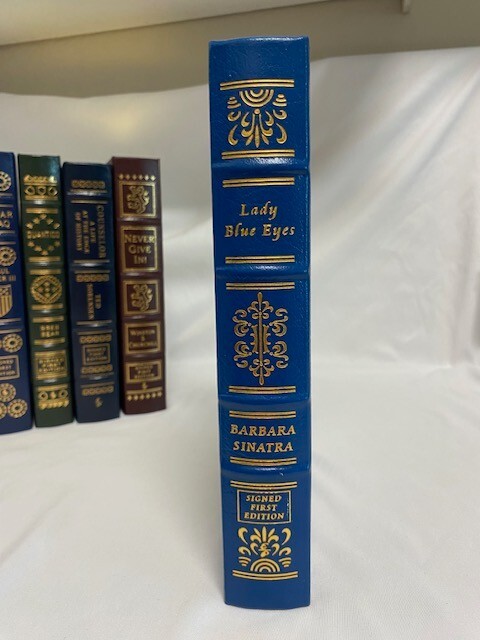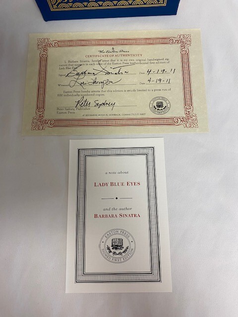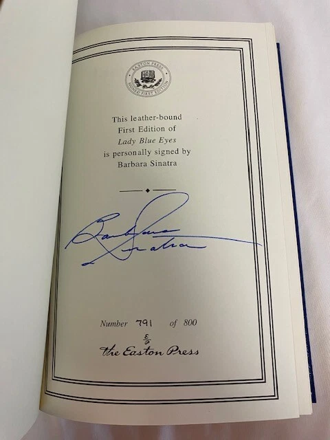 Thirty years after she first heard his voice singing on the jukebox at her local drive-in, Barbara Ann Blakely heard Frank Sinatra take the wedding vows that began his fourth, final, and most enduring marriage. In Lady Blue Eyes, Barbara Sinatra’s first public love letter to the husband she adored, she celebrates the sensational singer, possessive mate, sexy heartthrob, and devoted friend that she found in Frank. For more than two decades, Barbara was always by his side, traveling the globe and hosting glittering events for their famous friends, including presidents, kings, queens, Hollywood royalty, and musical legends. Among them were Sammy Davis, Jr., Princess Grace of Monaco, Bob Dylan, and Ronald Reagan. Each night, as Frank publicly wooed his bride with love songs from a concert stage, she’d fall in love with him all over again. From her own humble beginnings in a small town in Missouri to her time as a fashion model and her marriage to Zeppo Marx, Barbara Sinatra reveals a life lived with passion, conviction, and grace. A founder of the Miss Universe pageant and a onetime Vegas showgirl, she raised her only son almost single-handedly in often dire circumstances until, after five years of tempestuous courtship, she and Frank committed to each other wholeheartedly. In stories that leap off the page, she takes us behind the scenes of her iconic husband’s legendary career and paints an intimate portrait of a man who was variously generous, jealous, witty, and wicked. Coupled with revealing insights about many of Frank’s celebrated songs, this is much more than the story of a showbiz marriage. It is a story of passion and of a deep and lifelong love. Signed 791 of 800 by Barbara Sinatra. "Like New" condition. Well-kept in smoke free, pet free home.