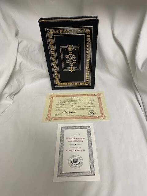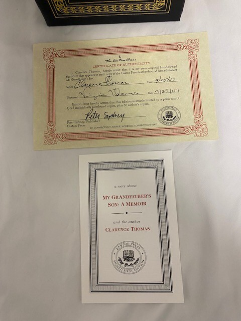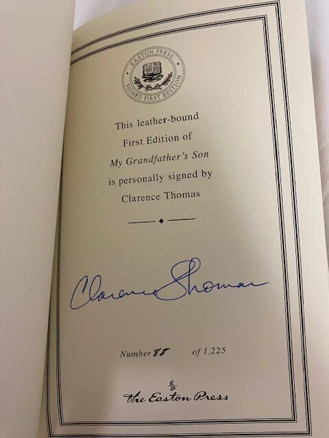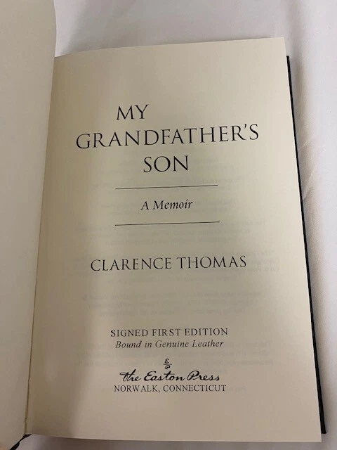 Thebook spans all of Thomas's life to the present, beginning with his earlychildhood in the Deep South and his mother's decision to send him andhis brother to be raised by her father and stepmother as she felt unable tocare for them. He tells of his upbringing by his grandparents, his time incollege and law school, and his career in government. Particular attention isfocused on his Supreme Court confirmation hearings . Although the memoir offers little of Thomas'semotional distress over divorcing his first wife, it expounds on hisintellectual evolution to conservatism, and the financial troubles that plaguedhim up through the late 1980s. It also includes a confession about hispreviously unknown struggle with alcohol. 289 pages Leather, Hardcover. Signed 88 of 1,125. This book is in "like new" condition. Well-kept in smoke free, pet free home.