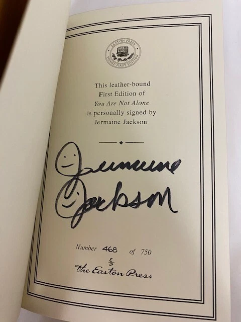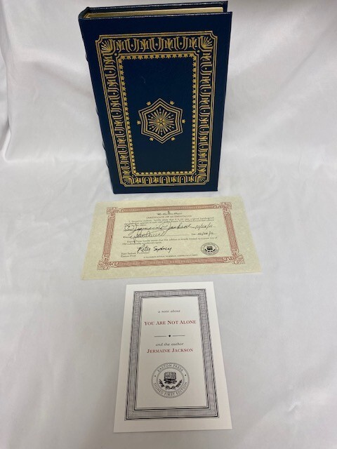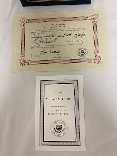 Jermaine Jackson—older than Michael by four years—offers a keenly observed memoir tracing his brother’s life starting from their shared childhood and extending through the Jackson 5 years, Michael’s phenomenal solo career, his loves, his suffering, and his tragic end. It is a sophisticated, no-holds-barred examination of the man, aimed at fostering a true and final understanding of who he was, why he was, and what shaped him. Jermaine knows the real Michael as only a brother can. In this raw, honest, and poignant account, he reveals Michael the private person, not Michael “the King of Pop.” Jermaine doesn’t flinch from tackling the tough issues: the torrid press, the scandals, the allegations, the court cases, the internal politics, the ill-fated This Is It tour, and disturbing developments in the days leading up to Michael’s death. But where previous works have presented only thin versions of a media construct, he provides a rare glimpse into the complex heart, mind, and soul of a brilliant but sometimes troubled entertainer. As a witness to history on the inside, Jermaine is the only person qualified to deliver the real Michael and reveal what made him tick, his private opinions, and unseen emotions through the most headline-making episodes of his life. Filled with keen insight, rich in anecdotes and behind-the-scenes detail, You Are Not Alone is the book for any true Michael Jackson fan and for anyone trying to make sense of the artist whose death was so premature. 442 pages Leather, Hardcover. Signed 1st edition 468 of 750. This book is in "Like New" Condition. Well-kept in smoke free, pet free home.