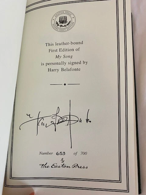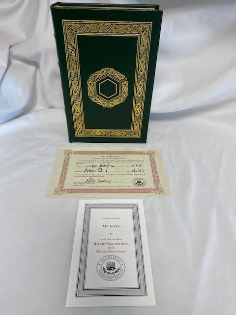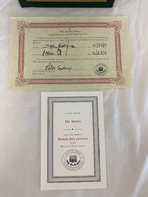 Harry Belafonte is not just one of the greatest entertainers of our time; he has led one of the great American lives of the last century. Now, this extraordinary icon tells us the story of that life, giving us its full breadth, letting us share in the struggles, the tragedies, and, most of all, the inspiring triumphs. Belafonte grew up, poverty-ridden, in Harlem and Jamaica. His mother was a complex woman—caring but withdrawn, eternally angry and rarely satisfied. His father was distant and physically abusive. It was not an easy life, but it instilled in young Harry the hard-nosed toughness of the city and the resilient spirit of the Caribbean lifestyle. It also gave him the drive to make good and channel his anger into actions that were positive and life-affirming. His journey led to the U.S. Navy during World War II, where he encountered an onslaught of racism but also fell in love with the woman he eventually married. After the war he moved back to Harlem, where he drifted between odd jobs until he saw his first stage play—and found the life he wanted to lead. Theater opened up a whole new world, one that was artistic and political and made him realize that not only did he have a need to express himself, he had a lot to express. He began as an actor—and has always thought of himself as such—but was quickly spotted in a musical, began a tentative nightclub career, and soon was on a meteoric rise to become one of the world’s most popular singers. Belafonte was never content to simply be an entertainer, however. Even at enormous personal cost, he could not shy away from activism. At first it was a question of personal dignity: breaking down racial barriers that had never been broken before, achieving an enduring popularity with both white and black audiences. Then his activism broadened to a lifelong, passionate involvement at the heart of the civil rights movement and countless other political and social causes. The sections on the rise of the civil rights movement are perhaps the most moving in the book: his close friendship with Martin Luther King, Jr.; his role as a conduit between Dr. King and the Kennedys; his up-close involvement with the demonstrations and awareness of the hatred and potential violence around him; his devastation at Dr. King’s death and his continuing fight for what he believes is right. But My Song is far more than the history of a movement. It is a very personal look at the people in that movement and the world in which Belafonte has long moved. He has befriended many beloved and important figures in both entertainment and politics—Paul Robeson, Eleanor Roosevelt, Sidney Poitier, John F. Kennedy, Marlon Brando, Robert Kennedy, Nelson Mandela, Fidel Castro, Tony Bennett, Bill Clinton—and writes about them with the same exceptional candor with which he reveals himself on every page. This is a book that pulls no punches, and turns both a loving and critical eye on our country’s cultural past. As both an artist and an activist, Belafonte has touched countless lives. With My Song, he has found yet another way to entertain and inspire us. It is an electrifying memoir from a remarkable man. 469 pages, Signed 673 of 700. This book is in "Like New" condition. Well-kept in smoke free, pet free home.