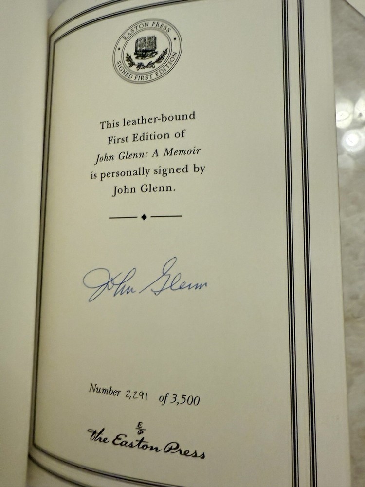 This limited edition first edition of John Glenn's memoir is a must-have for any collector or fan of the famous astronaut. Bound in beautiful leather and printed in English, this original Easton Press book is signed and numbered by the author himself. It was printed in 1999 in Norwalk, Connecticut, and is a perfect addition to any biography or autobiography collection. The book is in excellent condition and has never been personalized. It features special attributes such as being a limited edition and a signed copy. This is a rare find and a great opportunity to own a piece of history.