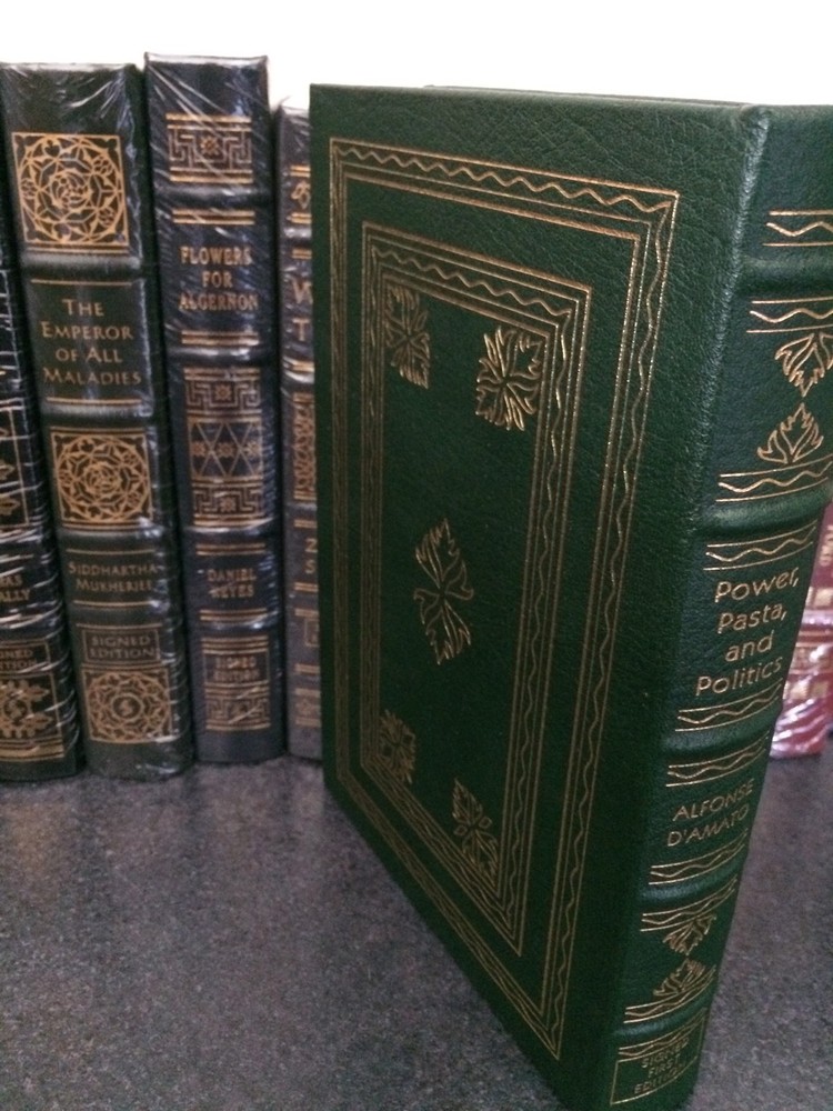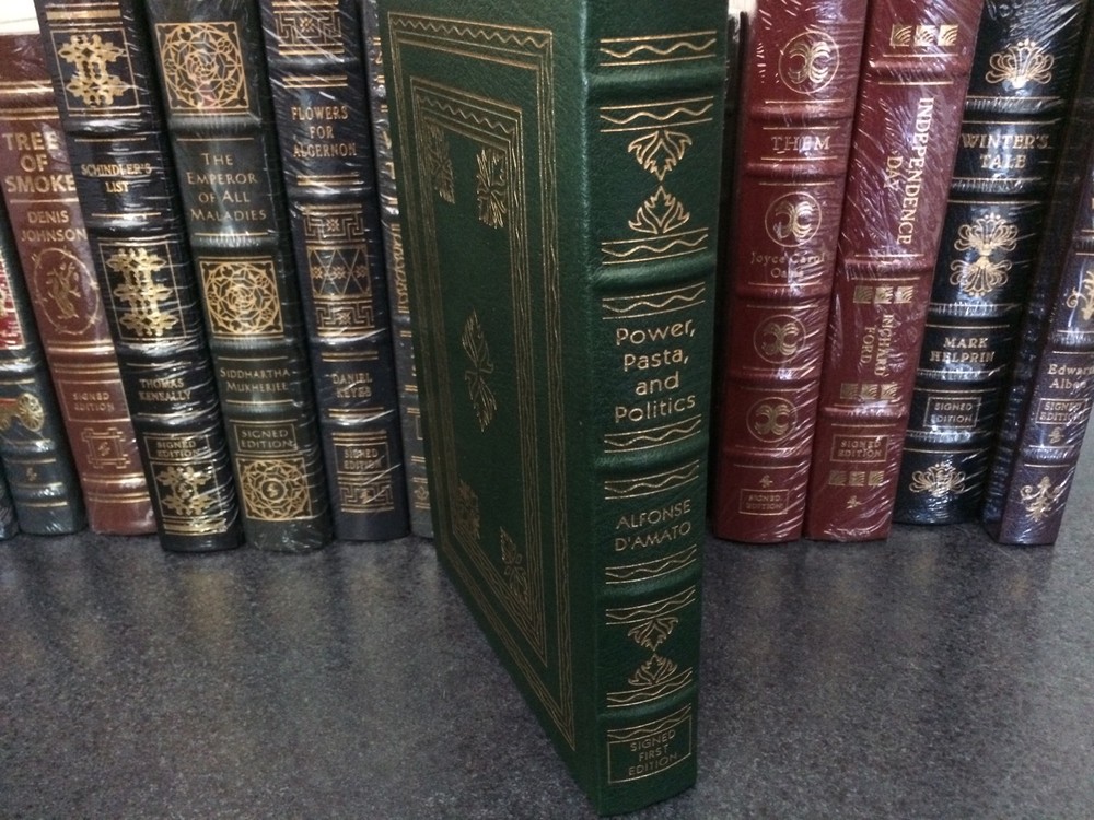 you are bidding on a Easton Press leather bound Signed first edition Book- Power, Pasta, and Politics by Alfonse D'amato . Never been read and in very good condition....