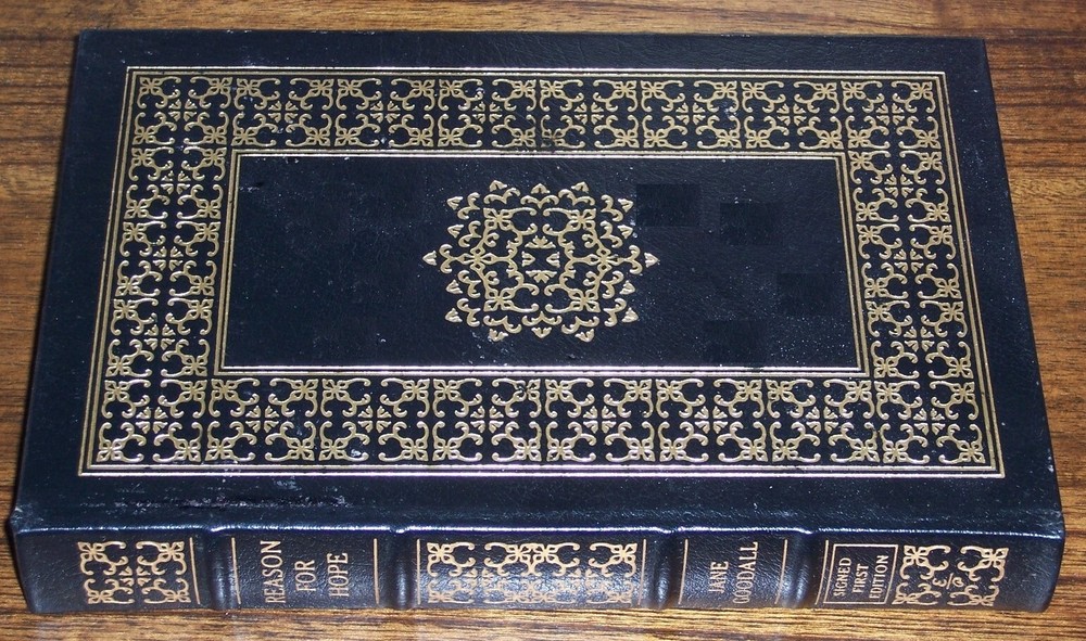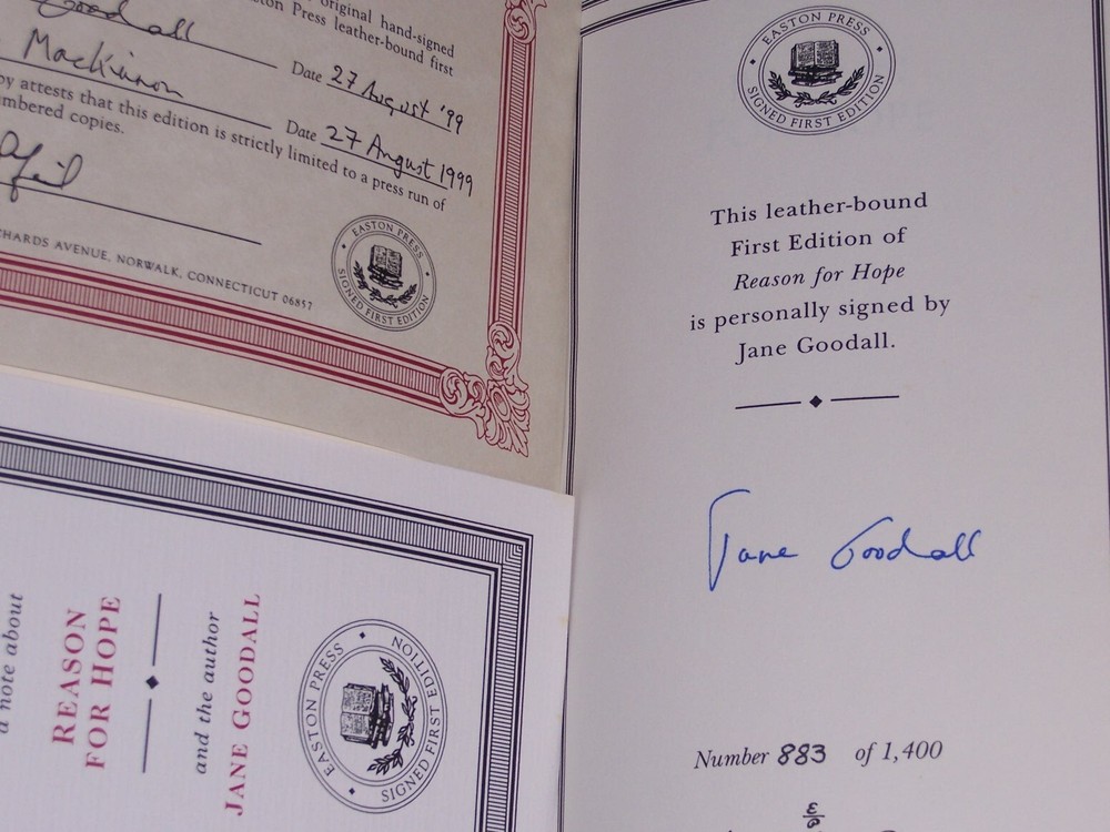 Signed Edition Easton Press REASON FOR HOPE: A Spiritual Journey by Jane Goodall with Phillip Berman personally signed by Jane Goodall with certificate of authenticity and A Note sheet Black leather hardcover with cover design out of print, do not miss this great deal Copyright by The Easton Press hubbed spine, bound in premium full leathers distinctive cover design, beautiful illustrations handsome, readable typefaces, permanent satin ribbon page marker elegant gilded page edges, endsheets of rich moire fabric thread-sewn pages for durability and strength, long-lasting high quality, acid-neutral paper CONDITION DESCRIPTION: like new and unread condition, tight binding, shiny gold page edging, beautiful bright endleaves, and satin ribbon page marker. It is a very special books to be added to your personal collection. SHIPPING / HANDLING: Book(s) will be handled/packed very safely, and shipped via USPS media mail with delivery confirmation.
