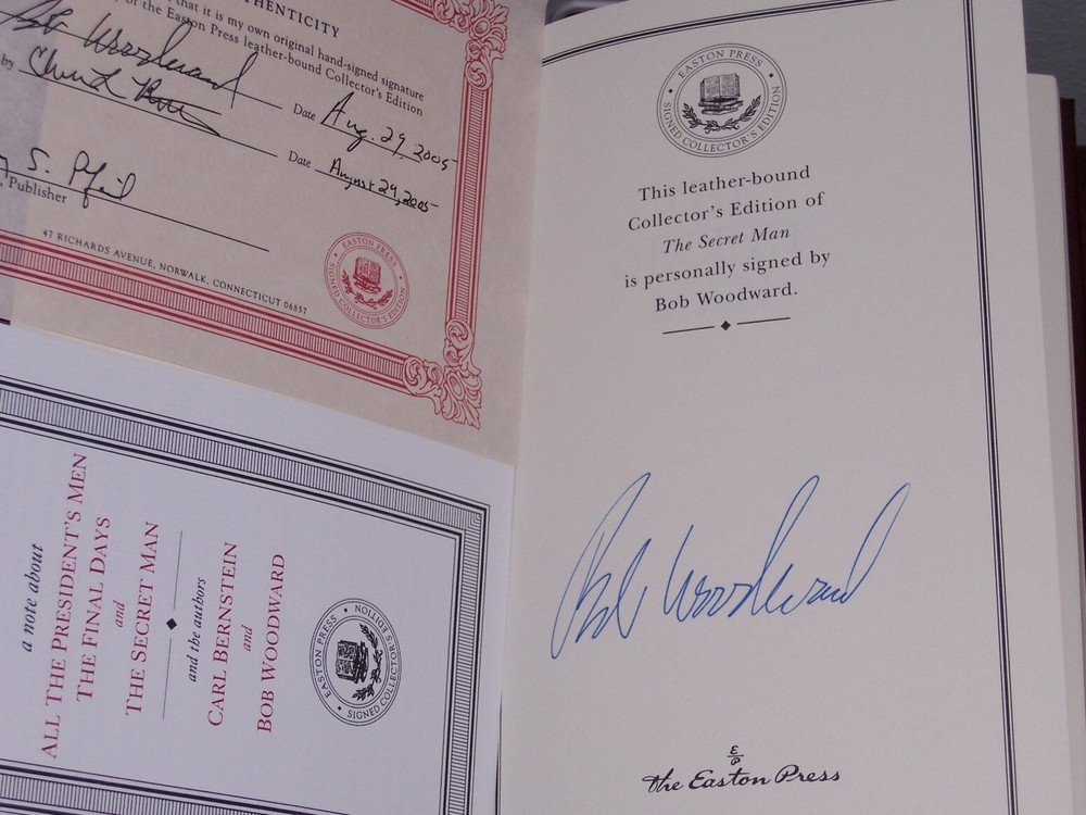 heirloom edition Easton Press The Secret Man: the story of Watergate's Deep Throat by Bob Woodward personally SIGNED by Bob Woodward with certificate of authenticity (COA) Distinct cover designs with decorations dimension 6 1/4" x 9 1/2” do not miss out this good deal Copyright by The Easton Press hubbed spine, bound in premium full leathers distinctive cover design, beautiful illustrations handsome, readable typefaces, permanent satin ribbon page marker elegant gilded page edges, endsheets of rich moire fabric thread-sewn pages for durability and strength, long-lasting high quality, acid-neutral paper CONDITION DESCRIPTION: Like new and unread condition, binding is tight and gold page edging still shiny, beautiful bright endleaves and satin ribbon page marker. This set could be a precious addition to your family library. SHIPPING / HANDLING: Book(s) will be handled/packed very safely, and shipped via USPS media mail with delivery confirmation.