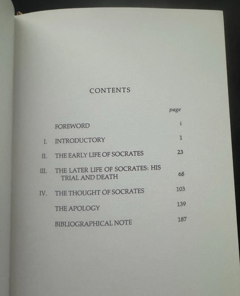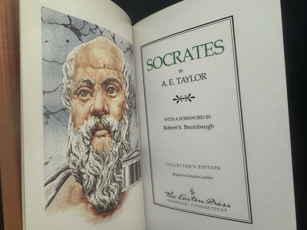 Socrates by A. E. Taylor, Published by Easton Press in Norwalk, CT in 1989. This volume is from Easton Press Library of Great Lives. This study of Socrates by Alfred Edward Taylor was first published in 1933. Easton Press book features from Easton Press website: " Features include: Fully bound in genuine leather. 22kt gold deeply inlaid on the "hubbed" spine. Superbly printed on acid-neutral paper that lasts for generations. Sewn pages — not just glued like ordinary books. Handsome moiré endpages and a satin-ribbon page marker. Gilded page ends." 100% of all sale proceeds benefit the Hilton Head Library.