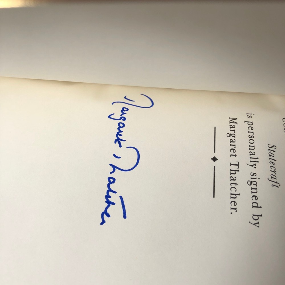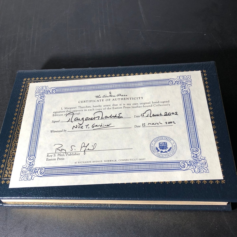 This Easton Press book titled "Statecraft" is a rare find for any political enthusiast. It features the signature of former British Prime Minister Margaret Thatcher and comes with a Certificate of Authenticity. The book is bound in high-quality leather and is written in English. The book covers various political topics and is a great addition to any collection. It was published by Easton Press in the United States and is an excellent conversation piece for any book lover. Get your hands on this unique item today! The item may have marks on the cover due to storage and a visible mark on the gilted edge as pictured.