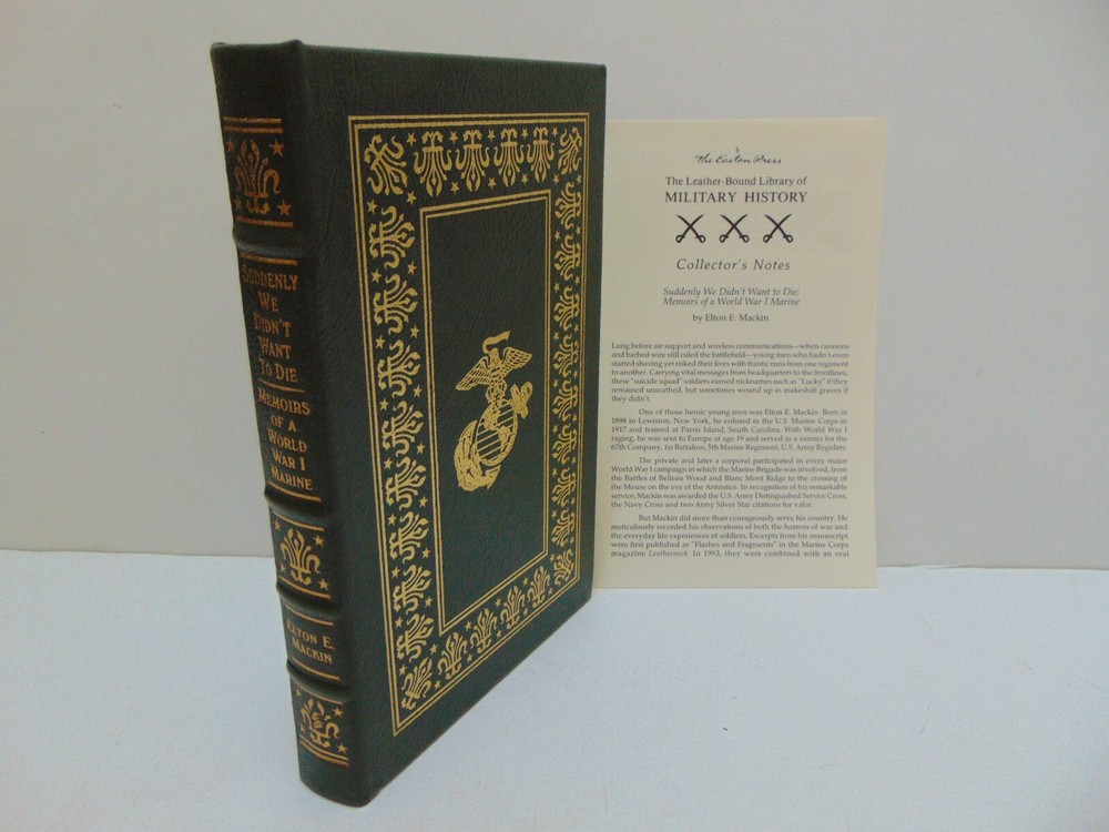 Easton Press Library of Military History Suddenly We DIdn't Want to Die: Memoirs of a World War I Marine By Elton E. Mackin This Easton Press book is in very good condition with no noted writing or highlighting and there is only minor shelf wear to the cover and to the page end gold gilding. The Library of Military History collector's note sheet is included. There is no bookplate or embossing stamp. The book will be carefully packaged for shipping. Please ask any questions prior to bidding. If you win multiple items, please wait for an invoice before paying otherwise we may not be able to combine shipping costs. (We will do our best to combine shipping however we will not hold items for an extended period of time.) NO international shipping. NO freight forwarding addresses. US orders only!