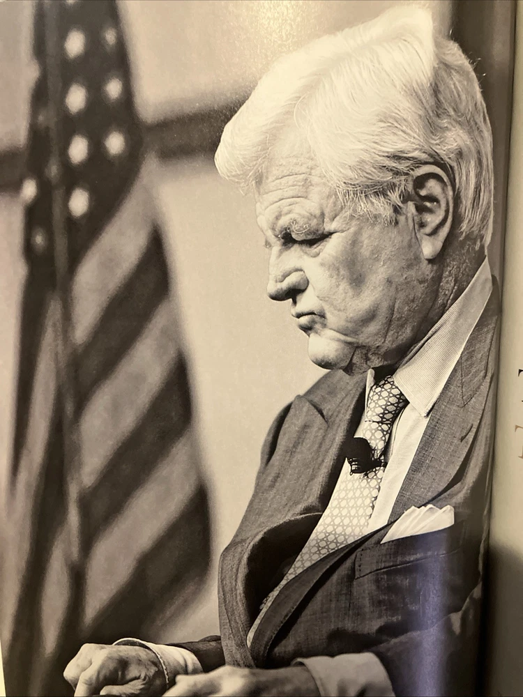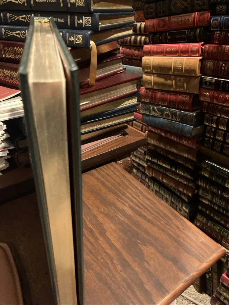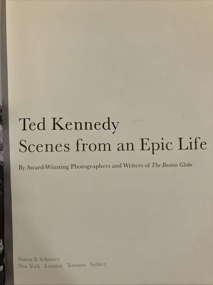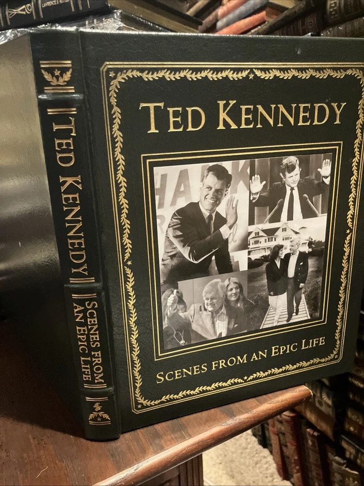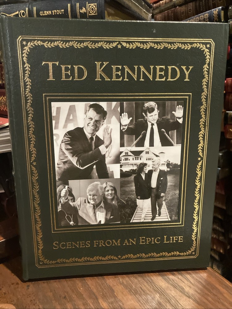 Easton Press leather edition of "Ted Kennedy: Scenes from an Epic Life, by Writers of The Boston Globe," a COLLECTOR'S edition, published in 2009. Bound in dark green leather with a collage of pictures on the front board, the book has camel tan moire silk end leaves, acid-free paper, Symth-sewn binding, a satin book marker, hubbed spine, gold gilding on three edges---in near FINE condition---except for a 'blank' attached bookplate on second blank page. Edward Moore Kennedy, who lived from 1932-2009, was an American lawyer and politician from Massachusetts who served as a U.S. Senator from 1962 until his death. The ninth child of Joseph and Rose Fitzgerald Kennedy, Ted was a member of a prominent Irish American family. His older brother John asked to be the newborn's godfather, a request the parents honored. As a child he was frequently uprooted and attended 10 schools by the age of eleven. He was an altar boy at St. Joseph's Church and was seven when he received his First Communion from POPE PIUS XII in the Vatican. He and his family lived in London when his father was the Ambassador to the Court of St. James, but Rose and the children returned to the U.S. when the Germans began bombing London. After high school, Ted attended Harvard where he was a mediocre student but excelled at football. He was also a member of the tennis team and participated in drama, debate, and the glee club. He was 6'2" tall, with broad shoulders, a thick head of dark brown hair and hairy chest---and women thought him "drop-dead handsome." Before he married Joan Bennett in 1958 at age 26, he had "bedded" scores of women in Europe and the U.S. In 1951, he enlisted in the U.S. Army after being expelled from Harvard for cheating on a Spanish exam. After his military service, he returned to Harvard where he graduated and later graduated from Law School at the University of Virginia where he had to study "four times as hard and four times as long" as other students to keep up. He was often arrested for reckless driving, but he was fun-loving and the "life of the party" and with his "Kennedy smile" and charming personality, he won hearts and even after marriage, women pursued him relentlessly and he often accommodated. He and Joan became parents to three children, Kara, Edward, and Patrick. In 1962, Ted was elected to the Senate from Massachusetts. His brother, John, was President of the U.S. and his brother, Bobby, was Attorney General. Until 1969, the Kennedys dominated the national scene. After t he "Chappaquiddick incident" of 1969 when Ted ran off a bridge on Martha's Vineyard and Mary Jo Kopechne was found dead several hours later in the submerged car, the news made national headlines. Ted pleaded guilty to leaving the scene and received a two-year suspended sentence. The incident and its aftermath hindered his chances of becoming president--although he ran for the Democratic Party's nominee but lost to the incumbent president, Jimmy Carter. Kennedy was known for his oratorial skills and his cry for modern American liberalism were among his best-known speeches. He championed interventionist government that emphasized economic and social justice. Over the course of his Senate career, he made efforts to enact universal health care. The photos in this volume capture his journey from the youngest of nine children to the patriarch and custodian of American liberalism. It is the long, impressive, and enduring story of a great American life with photos of his grandfather, Boston Mayor, Honey Fitz Fitzgerald, and his family. Ted Kennedy was the second most senior member of the Senate when he died and ranked fifth for continuous service as a senator. His brothers called Ted "the hardest- working one of the Kennedy clan." Jackie Kennedy Onassis wrote after Ted had walked her daughter, Caroline, down the wedding aisle: "On you, the carefree youngest brother, fell a burden a hero would have begged to have been spared." "We're all going to make it because you're always there with your love." He was buried with John and Jacqueline, and Robert, on the hillside in Arlington, between two maple trees. "He was not perfect, far from it, Ted. Jr. told the mourners. "But my father believed in redemption." Barrack Obama's eulogy conveyed a similar sentiment and a selection from one of Kennedy's favorite poems by William Wordsworth. 100 Folio-sized pages---a true "coffee table" book. I offer combined shipping.