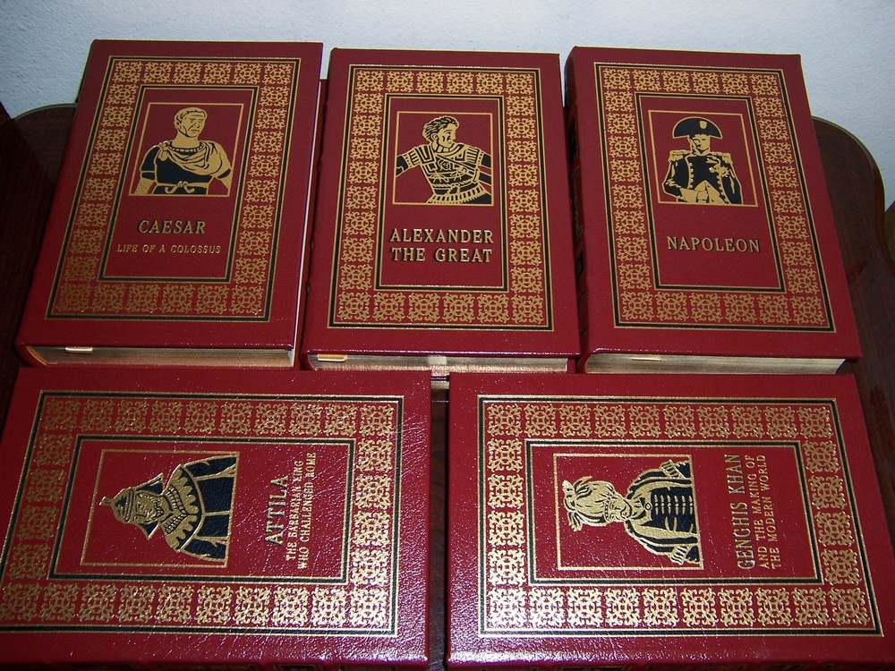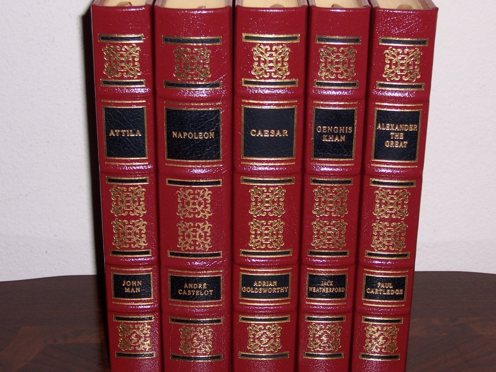 Ambition...determination...command...victory... Easton Press THE CONQUERORS in 5 volumes by various authors Wine red leather hardcover, uniform cover design Portrait stamped on the front cover measured by 6 1/2" x 9 1/2" do not miss out this good deal Copyright by The Easton Press hubbed spine, bound in premium full leathers distinctive cover design, beautiful illustrations handsome, readable typefaces, permanent satin ribbon page marker elegant gilded page edges, endsheets of rich moire fabric thread-sewn pages for durability and strength, long-lasting high quality, acid-neutral paper LIST OF TITLES: a complete series in 5 volumes: 1. Alexander The Great: The Hunt for a Great Past, by Paul Cartledge 2. Julius Caesar: Life of a Colossus, by Andrian Goldsworthy 3. Attila The Hun: The Barbarian King who Challenged Rome, by John Man 4. Genghis Khan, and the Making of Modern World, by Jack Weatherford 5. Napoleon Bonaparte, by Andre Castelot, translated from the French by Guy Dnaiels, foreword by Stephen T Ross CONDITION DESCRIPTION: Like new and unread condition, binding is tight and gold page edging still shiny, beautiful bright endleaves and satin ribbon page marker. This set could be a precious addition to your family library. SHIPPING / HANDLING: Book(s) will be handled/packed very safely, and shipped via USPS media mail with delivery confirmation.