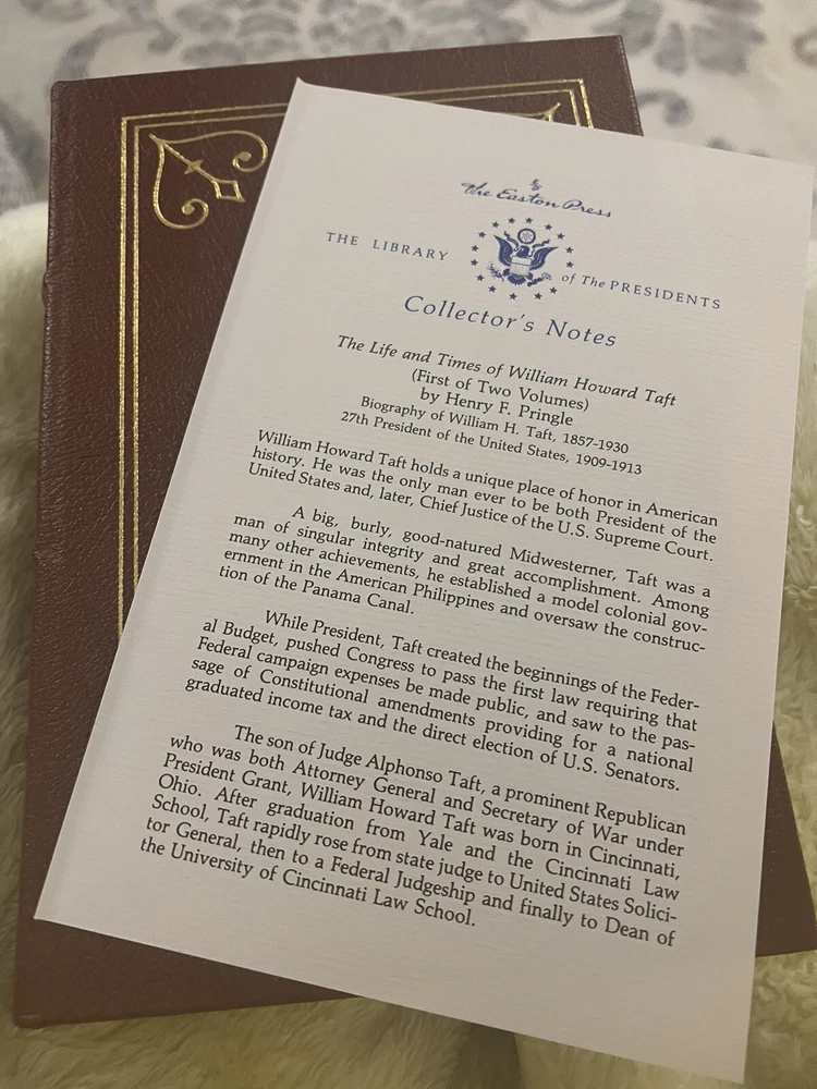 This Easton Press book, titled "THE LIFE AND TIMES OF WILLIAM H TAFT," is a rare and valuable addition to any collection. The leather binding and gold gilt detailing add to its beauty and elegance. The publisher, Easton Press, is well-known for producing high-quality books, and this one is no exception. Fully and tightly bound in genuine leather. 22kt gold accents deeply inlaid on the "hubbed" spine. Heavy duty binding boards enhance the book’s durability. Superbly printed on acid-neutral paper that lasts for generations. Sewn pages — not just glued like ordinary books. Handsome moiré endpages and a satin-ribbon page marker. Gilded page ends. The book is perfect for anyone interested in collectible and antiquarian books, as well as those who appreciate the life and times of William H Taft. It is a must-have for any serious book collector and is sure to be a cherished item in any library. Leather with silk book mark. This book is in used Excellent condition but does have a signature label inside but can be covered with your own Easton press label. Such a beautiful book