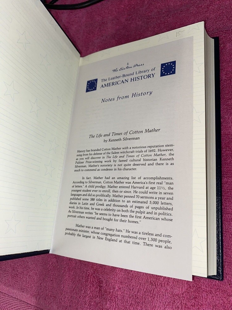 This Easton Press collector's edition of "The Life & Times of Cotton Mather" by Kenneth Silverman is a must-have for any history enthusiast. Printed in 1989, this book explores the life of one of America's most influential Puritan ministers and scholars. With a beautiful leather binding and gold accents, this book will make a wonderful addition to any collection. This book has been well-maintained and is in near-mint condition. It contains no markings, tears, or other damage. The pages are crisp and clean, and the spine is tight. Whether you are a collector or simply looking for an engaging read, this book is sure to delight. Listing and template services provided by inkFrog