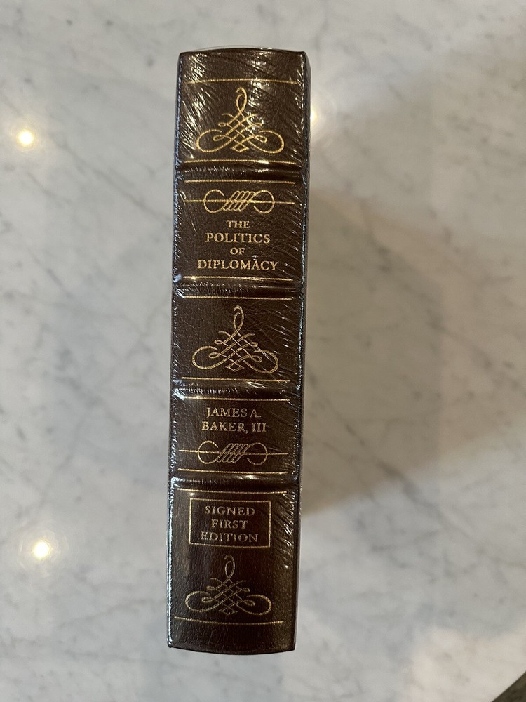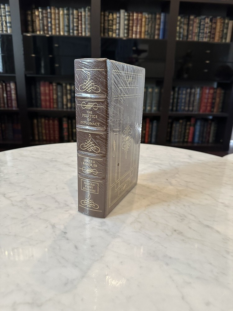 This is an Easton Press leather bound edition of "The Politics of Diplomacy" by James Baker III. The book is signed by the author and has a Certificate of Authenticity within, as all signed Easton Press books do. The book is in new condition and is factory sealed.