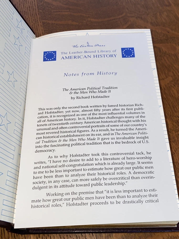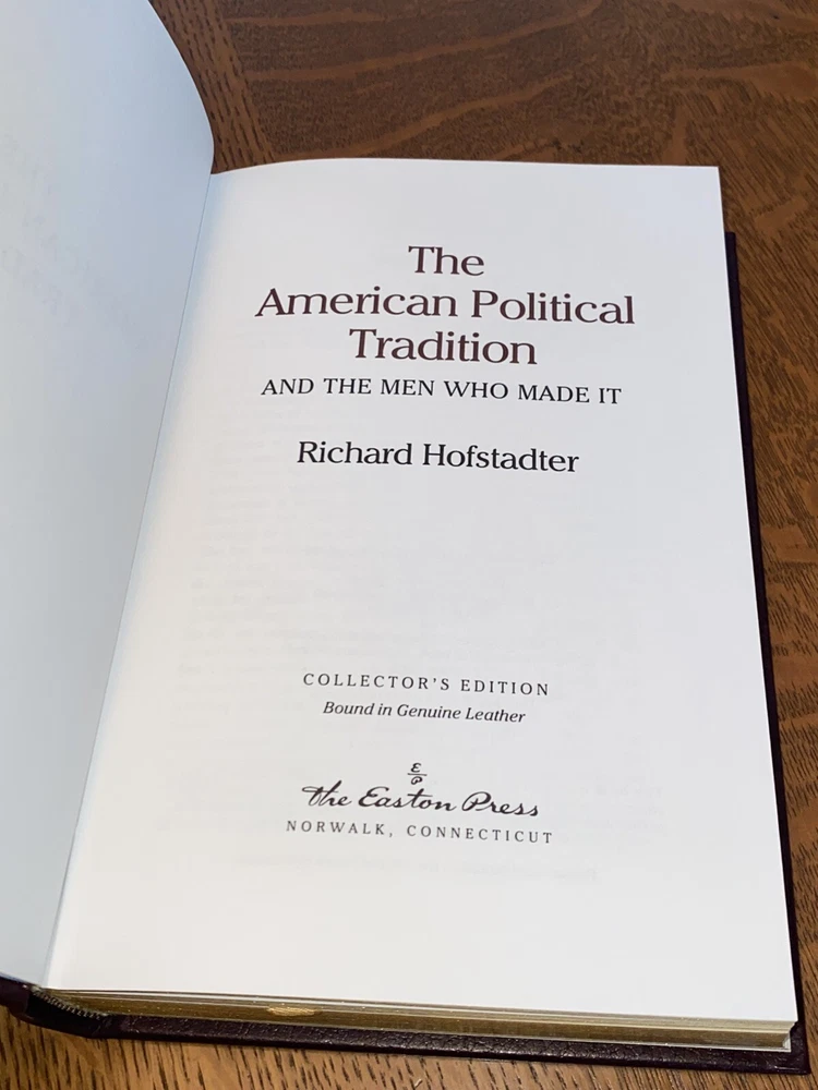 The product is a collector's edition of "The American Political Tradition" by Richard Hofstadter, published by Easton Press in 1995 in Norwalk, Connecticut. It is an original printing in English, focusing on American politicians and political topics. The book is bound in leather and does not feature any signatures or personalization. This edition is a valuable addition to any collection of books on North American history and politics. Excellent condition. Feel free to contact me if you have any questions.