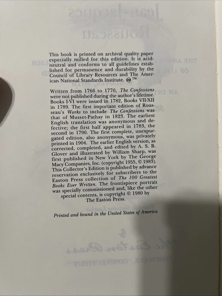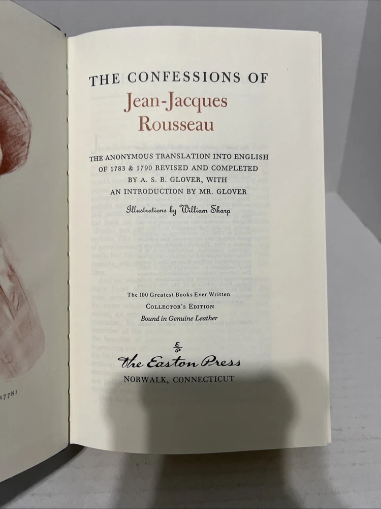 Delve into the profound reflections of Jean-Jacques Rousseau with the 1980 Collector's Edition of "The Confessions" from Easton Press. This leather-bound volume, published in Norwalk, Connecticut, offers a luxurious reading experience, enhanced by the illustrative works of William Sharp. A treasure for both bibliophiles and philosophy enthusiasts, this book is a journey through Rousseau's life and thoughts, presented in beautiful English. As part of a distinguished collection of classics, this edition is a testament to the art of bookmaking. It stands as an example of literary craftsmanship, with no modifications from its original state, preserving the authenticity of its era. The unit, housed in the United States, is a singular piece that promises to be a centerpiece in any collection, celebrating the contributions of Western philosophy.