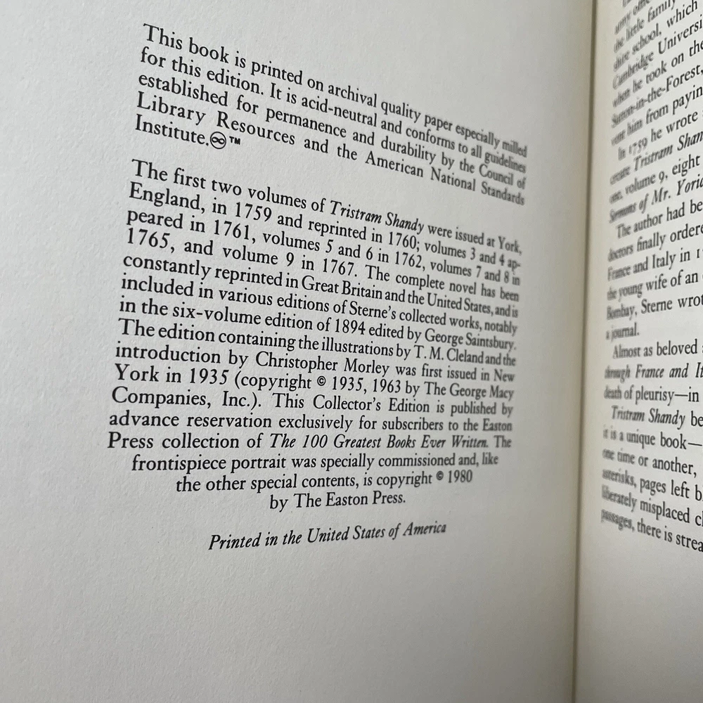 This rare and highly sought-after collector's edition of Laurence Sterne's "The Life and Opinions of Tristram Shandy" is a must-have for any book enthusiast. Printed by Easton Press in 1980, this edition bound in leather and boasts special attributes that make it a true gem. The book is a perfect addition to any collection of antiquarian and collectible books. With its unique features and beautiful binding, it's sure to be a conversation starter. Don't miss out on the opportunity to own this piece of literary history.