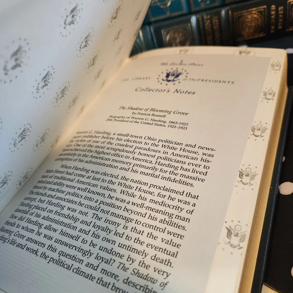 The Easton Press publication titled "The Shadow of Blooming Grove" by Francis Russell is part of "The Library of the Presidents" series. This leather-bound book, published in 1988 in Norwalk, CT, is a political biography focusing on Warren G. Harding. The collector's notes and leather binding make it a valuable addition to any collection of political biographies, especially for those interested in American history and presidential figures. Overall, this book offers insights into the life and legacy of President Harding, making it a notable piece for collectors of historical literature.