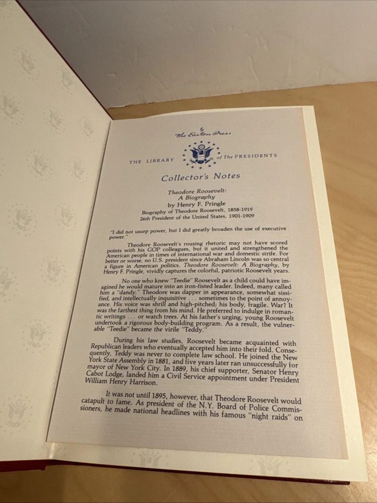 This Easton Press edition of Theodore Roosevelt by Henry F. Pringle is a stunning collector's piece! The leather-bound cover, gilded edges, and high-quality paper make it feel luxurious. The biography itself is engaging and well-researched, offering deep insights into Roosevelt's life. Arrived safely with USPS Media Mail—perfect for history buffs and book lovers alike!