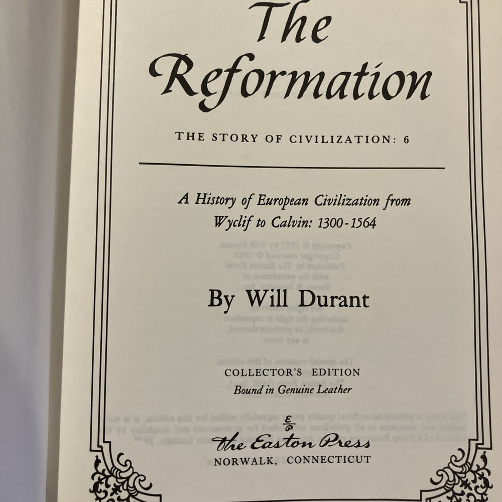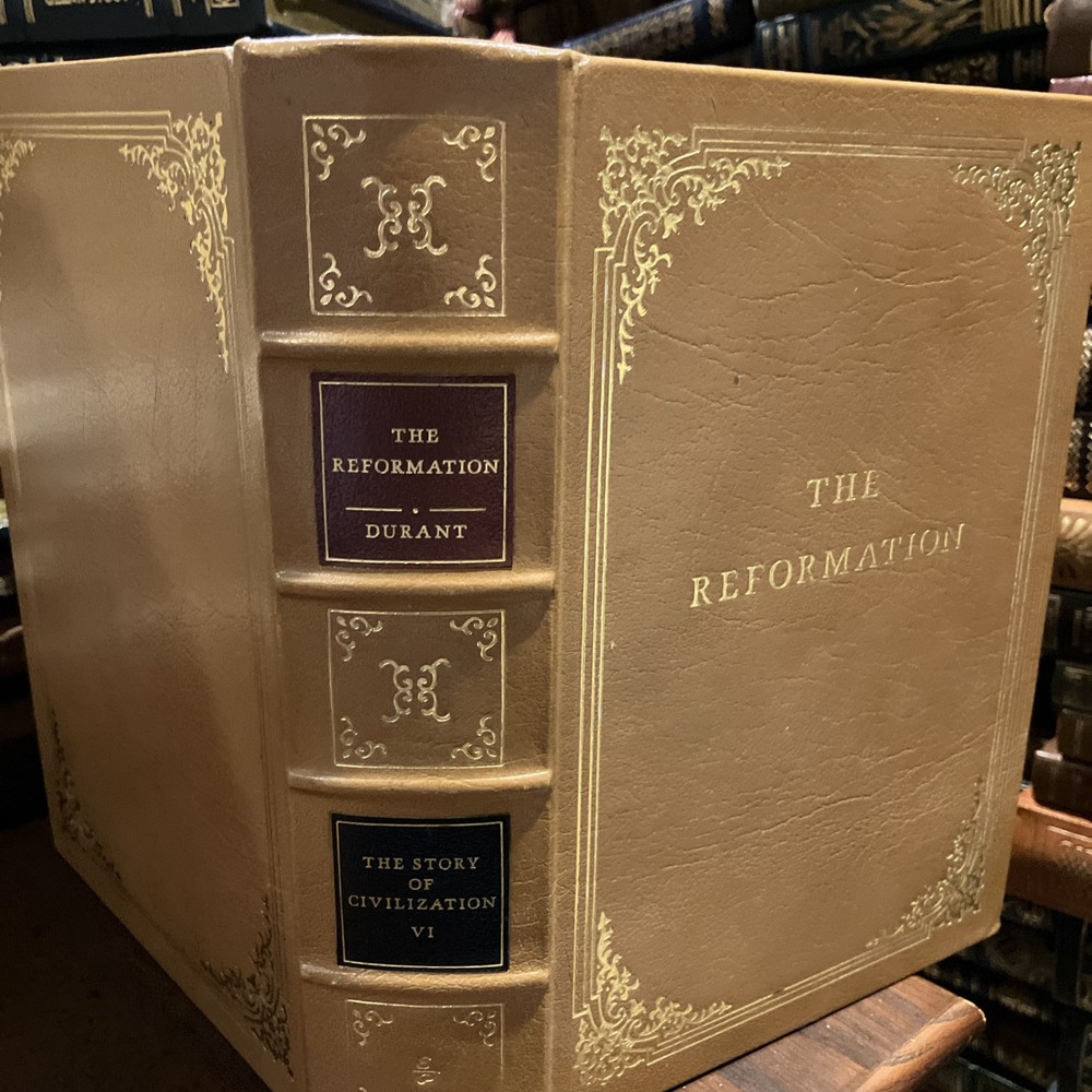 This Easton Press leather edition of Will Durant’s *The Reformation* is stunning—every detail feels luxurious! The camel tan leather, silk end leaves, and gold gilding make it a collector’s dream. Durant’s masterful history of 1300-1564 Europe comes alive in this beautifully bound volume, with its acid-free pages and Smyth-sewn durability. A perfect centerpiece for any bookshelf, blending scholarship with elegance. Pristine condition too—definitely worth owning!