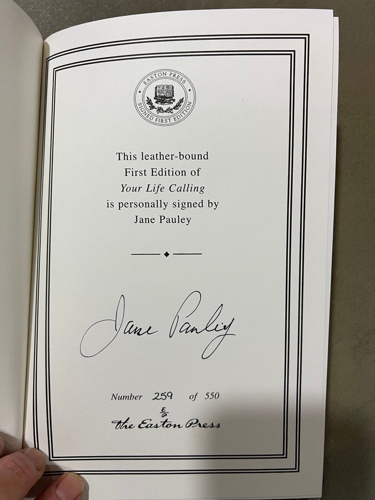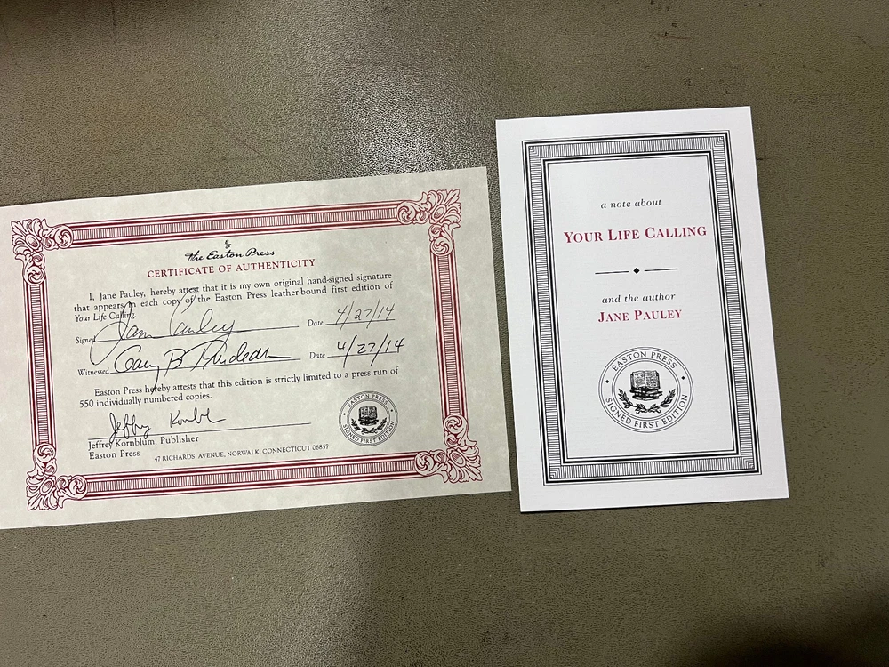 Your Life Calling - Jane Pauley SIGNED Easton Press 1st Editions Excellent Condition with Certificate of Authenticity! New Books get listed daily !!! 100s of Easton Press and Franklin Library books available!! All books get cleaned with a leather cleaner to remove any dust, odor and restore the beauty of leather!! Combined Shipping Discount: USA buyers - every book $1 off International combined shipping: 1 or 2 books - $45 3 or 4 books - $75 5 + books $17 per book 10+ books $13 per book WE SHIP DAILY!! RETURNS: Hassle-Free 30-days return policy and we pay for a return !! Check our Inventory (Link to eBay Store): http://stores.ebay.com/EastonFranklinBooks