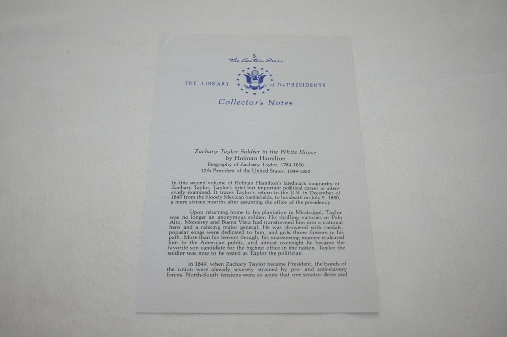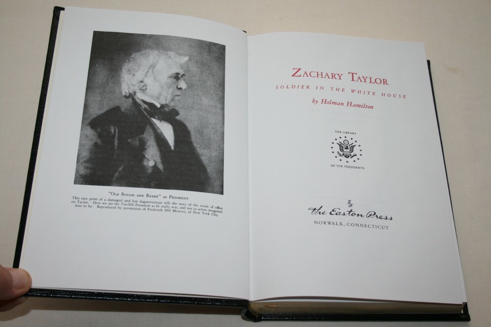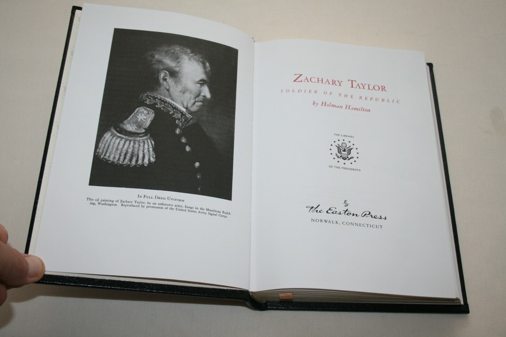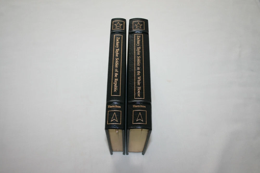 From the Easton Press Library of Presidents Collection... Zachary Taylor Complete 2 Volume Set Soldier in the White House & Soldier of the Republic by Holman Hamilton Copyright 1989 by The Easton Press Bound in Premium Full Leather These volumes contain all of the classic Easton Press trimmings: Premium Leather Decorated Endleaves Distinctive Cover Design Hubbed Spine, Accented in Real 22KT Gold Satin Ribbon Page Marker Gilded Page Edges Long-lasting, High Quality Acid-neutral Paper Smyth-sewn Pages for Strength and Durability Beautiful Illustrations Scarce titles in any condition, this two-volume set is in Absolute Mint and Unread condition. The front and back covers are both in Perfect condition and the gilded page edges show hardly any wear at all! The bindings are tight and square without spine lean. There are no attached bookplates nor any other signs of previous ownership. This set is part of The Library of Presidents Collection published by Easton Press and comes complete with both Collector's Notes. It would be a beautiful addition to your Easton Press collection. Overall, this set is a grade collector's set. This set is very elusive in this superior condition, as only a limited number of them were ever published, so now is the time to act. Hopefully you can add this set to your collection and enjoy it in the years to come... Please Email Me With Any Questions You Might Have! Shipping Info: Buyer to Pay Shipping & Handling International Bidders Pay Extra Shipping Good luck and happy bidding!