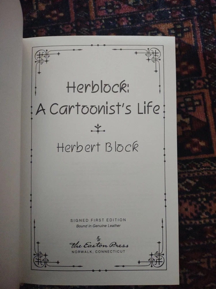 New Unread- Clean Bright Tight Book with the exception of top right gilt fade. - Signed by Herb Block Free Shipping Free Returns From Amazon Books Herblock: A Cartoonist's Life tells of the remarkable career that has spanned the era from Roosevelt to Clinton. Herb Block opposed isolationism before World War II; warned of nuclear hazards in the '40s; opposed McCarthyism in the '50s and racism in the '50s and '60s; and zeroed in on Watergate in the '70s and Iran-contra and other Reagan-Bush scandals in the '80s. He coined the word "McCarthyism" and describes that time of fear. He also writes engagingly about personal incidents and meetings with public figures.