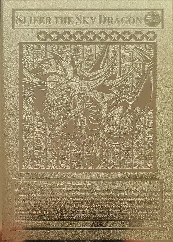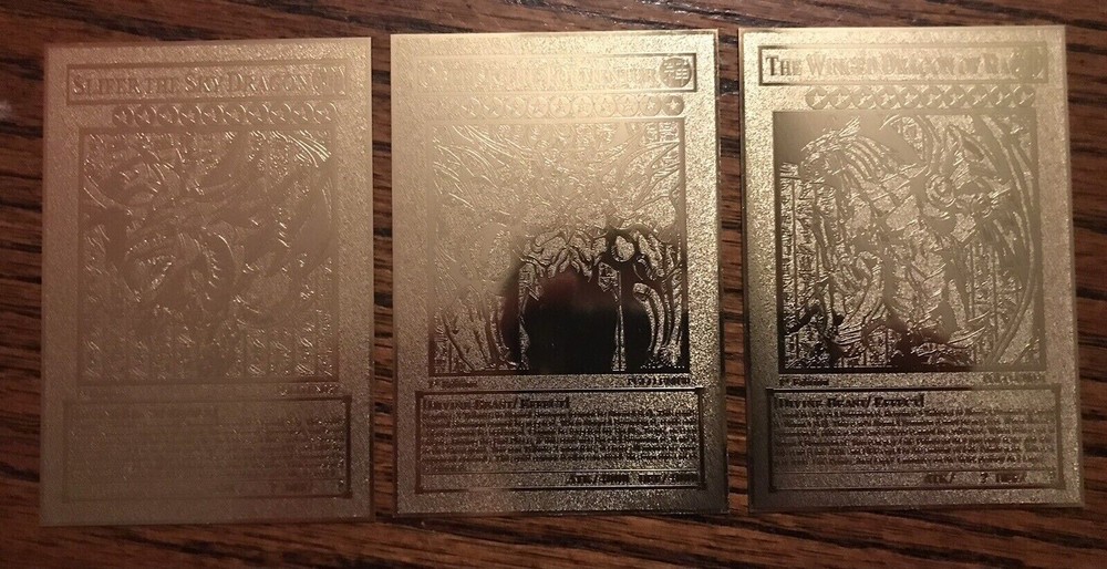 Grab your hands the iconic and gorgeous Full Color Egyptian God Metal Yugioh Cards! This includes Obelisk the Tormenter, Slifer the Sky Dragon, and the Winged Dragon of Ra. These cards are absolutely stunning and are sure to be a wonderful gift for any Yugioh fan! Laser-etched Gold Metal Cards More Durable than Paper Cards High-quality Design Fits in a 3-Ring Binder Beautiful, gold metal