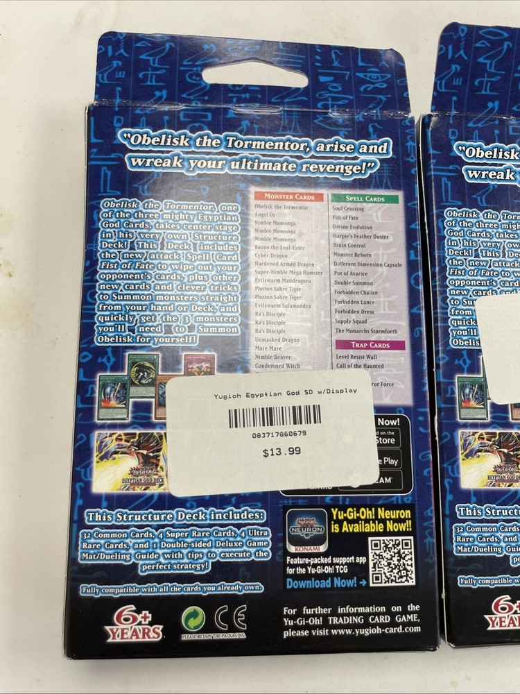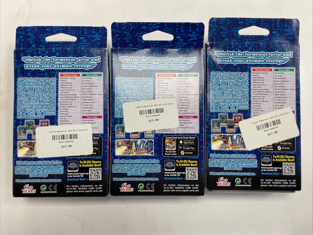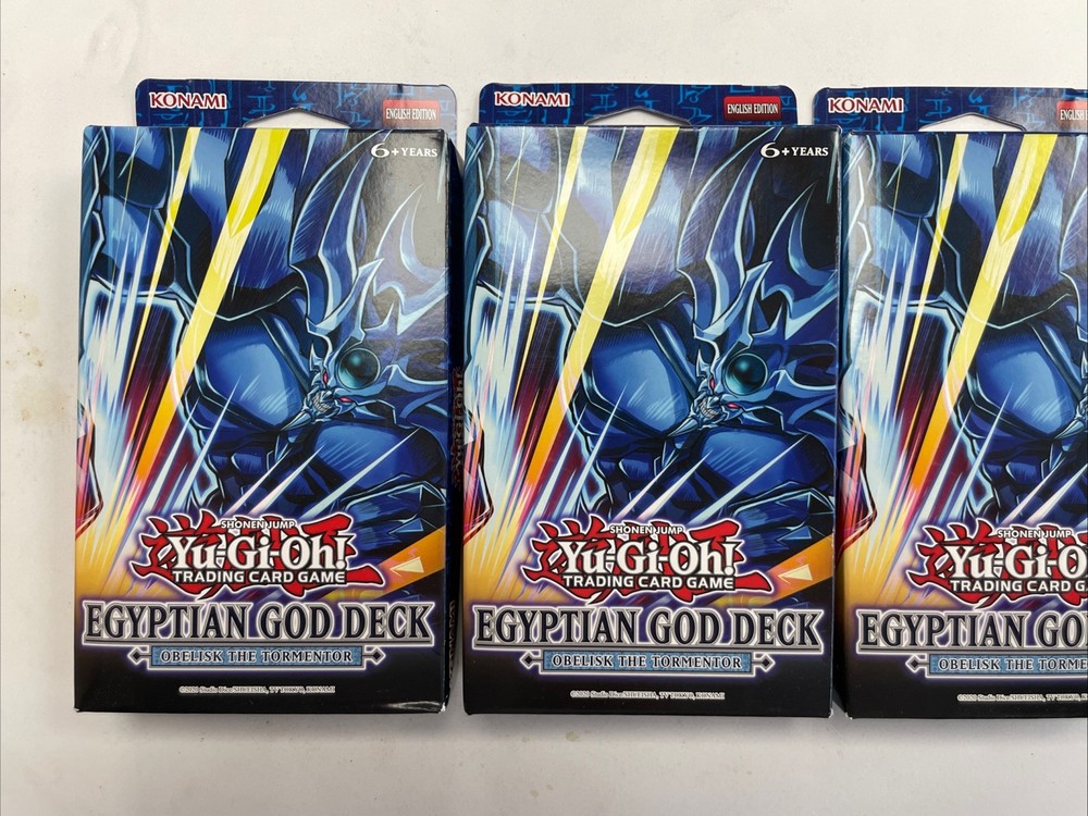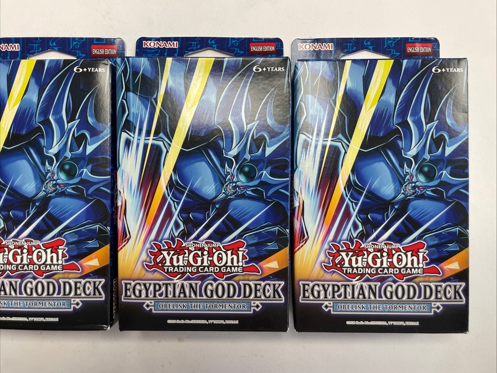 Unleash the power of ancient Egyptian mythology on your opponents with the Egyptian God Deck: Obelisk the Tormentor. This sealed pack is a must-have for any Yu-Gi-Oh! enthusiast, featuring the formidable Obelisk in its 1st Edition glory. The deck is part of the Yu-Gi-Oh Starter & Structure Decks set, ensuring a rich addition to your collection. Expand your game with this pack's unique configuration, designed to enhance your dueling experience. Whether you're a seasoned player looking to upgrade your deck or a collector seeking to add to your trove of strategic cards, this lot of three sealed packs promises to be a valuable acquisition for any Yu-Gi-Oh! fan. Lot of 3 unopened decks
