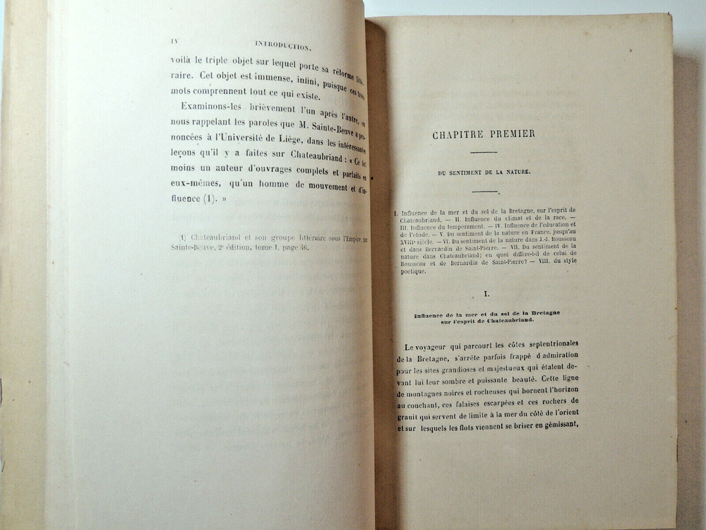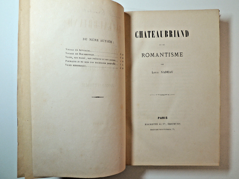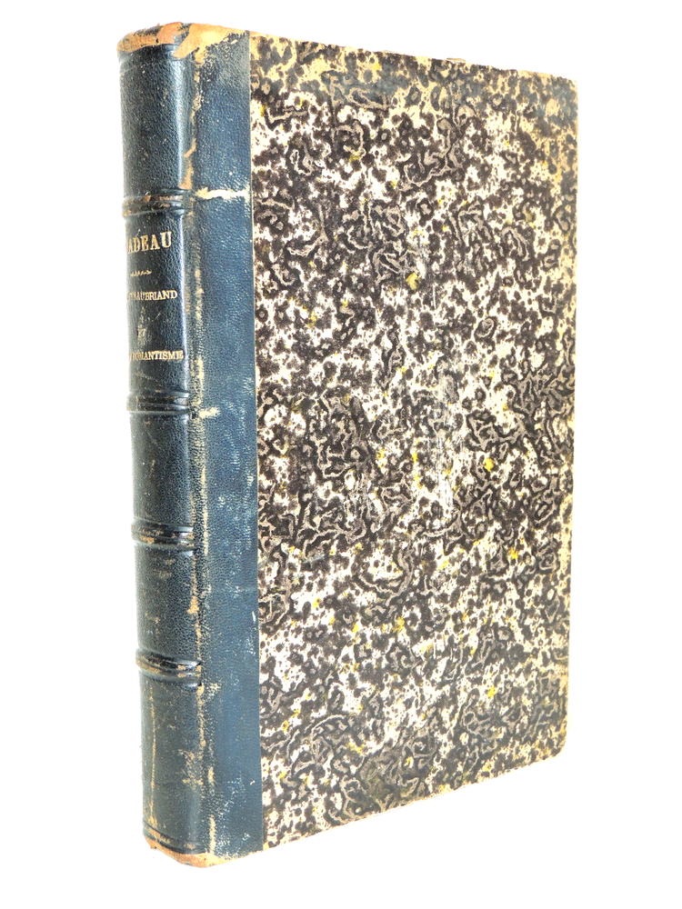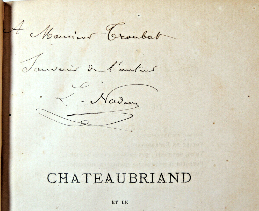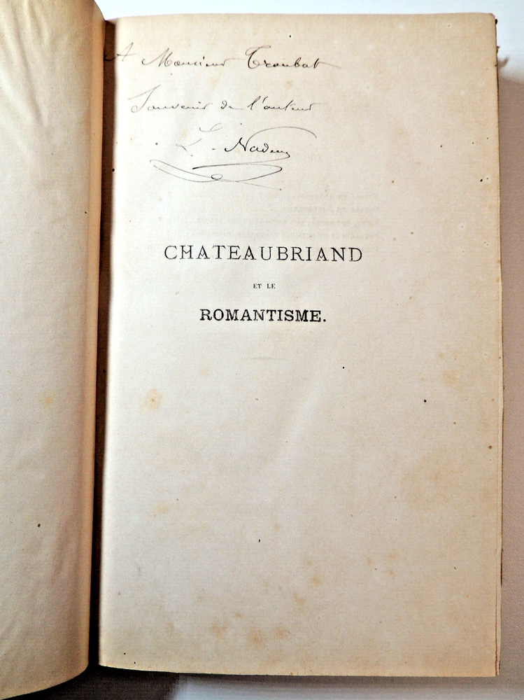 Louis Nadeau. Chateaubriand et le romantisme Importante étude littéraire sur Chateaubriand. du sentiment de la nature, influence de la mer et de la Bretagne, des passions, influence du climat et de la race, du sentiment religieux.. envoi de l'auteur à Monsieur Troubat. ( Jules Troubat, secrétaire de Sainte Beuve.) Louis Nadeau est un auteur du 19e connu principalement pour ses ouvrages de voyages en France. vol in4, relié demi cuir, frottements, 26x18cm, parfait état intérieur, 394pp Paris, Hachette, ss date 1890 ref/242