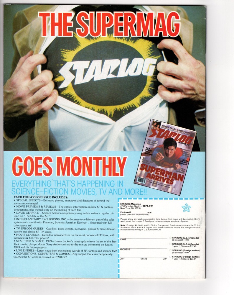 FANGORIA #1 (1979) Includes Foldout Godzilla Poster - The horror equivalent of sci-fi sister publication Starlog, Fangoria is devoted to "monsters, aliens and bizarre creatures" and is touted by its publisher to be the "first classy, professional, pictorial news magazine covering the world of fantasy." Issue #1 includes: a welcome letter from publisher Kerry O'Quinn; articles about Dr. Who and The Amityville Horror; a feature on Battlestar Galactica's lost aliens; a foldout Godzilla poster; "Twenty-five Years with Godzilla"; Tom Savini revealing his makeup techniques; a photo preview of Alien; a behind-the-scenes look at The Creature from the Black Lagoon; an interview with Christopher Lee; and more. Godzilla featured on the cover. Cover price $1.95. Pu blisher: O'QUINN STUDIOS The condition is GRADE 8.0 Since we value our customers so much, we NEVER use "stock photos". We take the time to photograph or scan each item ourselves so you can buy with confidence! We ship worldwide! Yes, we do offer multiple purchase shipping discounts. Be sure to add yourself to our store eNewsletter. Your privacy is important to us and as such we do not share or sell any customer information! INTERNATIONAL CUSTOMERS, PLEASE READ: Falsifyi ng customs forms is a crime. All items will be marked as "merchandise " and shall have the exact purchase price. ABSOLUTELY NO E XCEPTIONS!!
