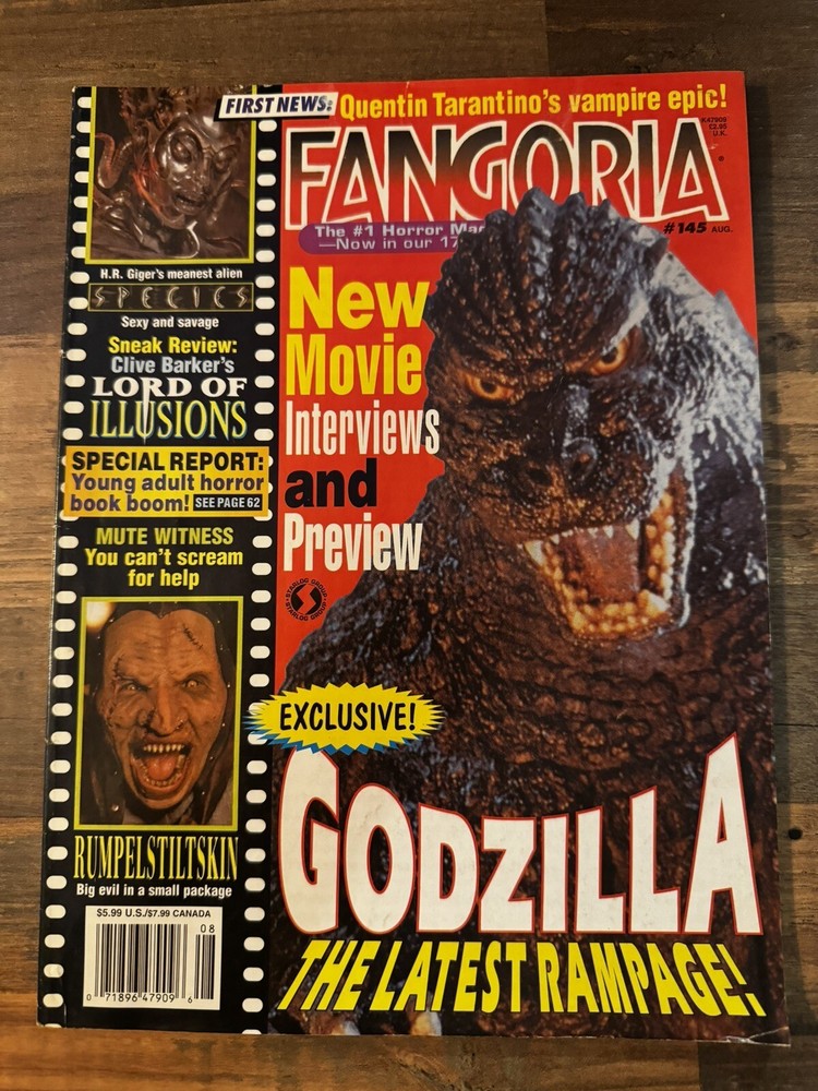 This is a rare edition of FANGORIA #145 Magazine from August 1995, featuring illustrated content on horror topics such as Godzilla, Rumplestiltskin, and Species. The publication is in English language and was published by Fangoria. It has contributors from various authors and publishers, and has a monthly publication frequency. The issue number is 145, and it falls under the collectibles, comic books & memorabilia, and magazines categories. This edition is an antique item, ex libris, and was manufactured in the United States.