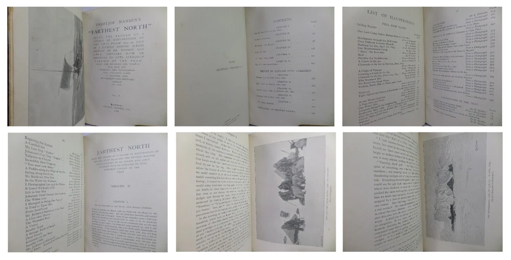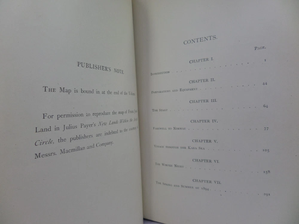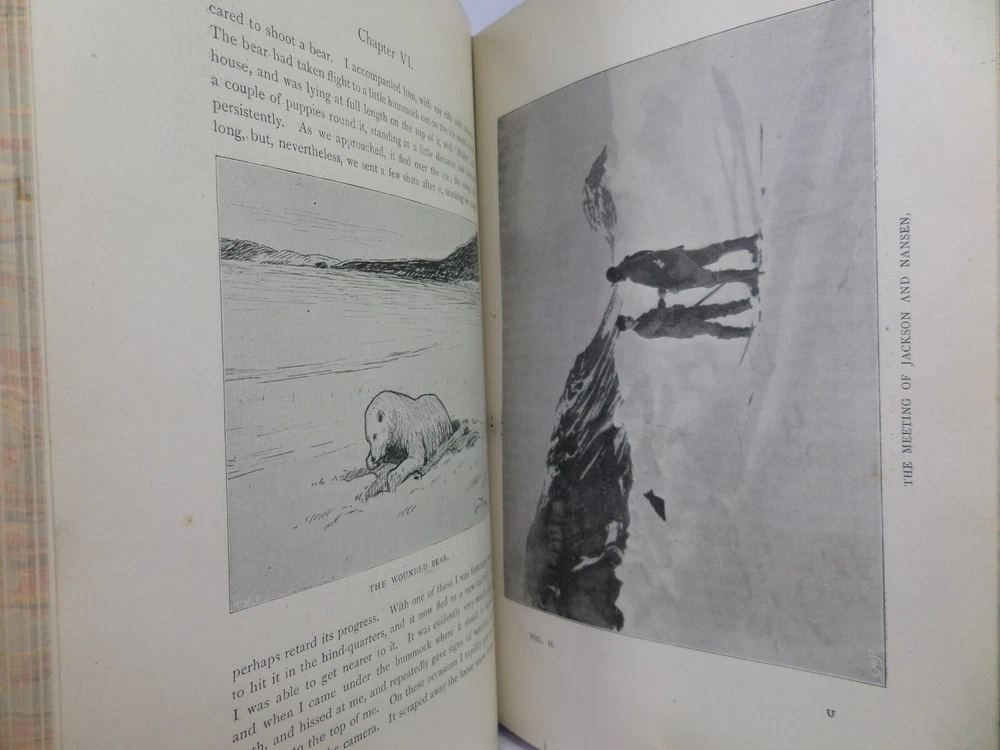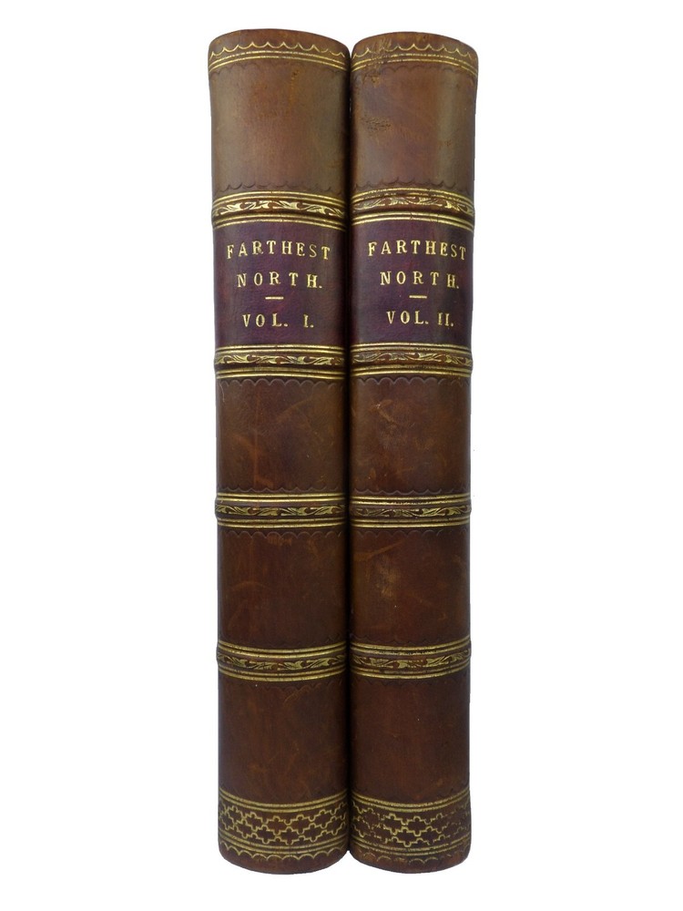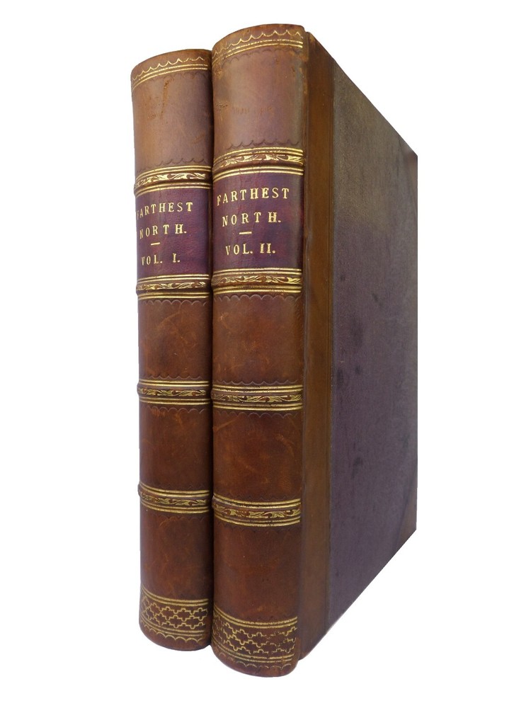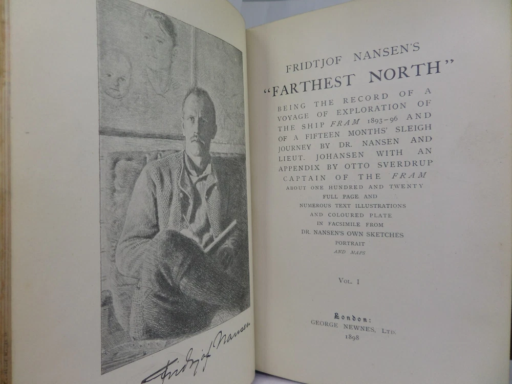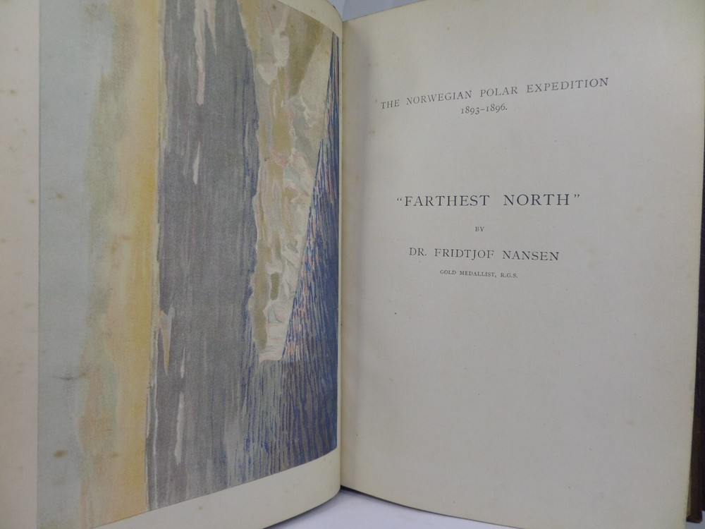 [NANSEN, FRIDTJOF (1861-1930)]. Farthest North: Being the Record of a Voyage of Exploration of the Ship Fram 1893-96 and of a Fifteen Months' Sleigh Journey by Dr. Nansen and Lieut. Johansen with an Appendix by Otto Sverdrup, Captain of the Fram . About One Hundred and Twenty Full Page and Numerous Text Illustrations and Coloured Plate in Facsimile from Dr. Nansen's own Sketches, Portrait and Maps. London: George Newnes, Ltd., 1898. Second edition. In two volumes (complete). Leather-bound. Hardcover. Large octavo (240 x 155 mm). Pp. [xv], 480; [viii], 456. English text. Handsomely r ebound in half-calf, the spines gilt with cloth sides, marbled page edges and endpapers. One colour plate from Nansen's own sketch, portrait frontispiece of Nansen, "around 120 full page black and white illustrations", plus many illustrations in the text. Fold out map in colour to the rear of vol.1. Condition: VERY GOOD. Bindings tight and secure with the hinges and joints intact. A little light marking to boards. Interiors very well-preserved. Without previous ownership markings. Notes: Nansen's own account of "a remarkable achievement in Polar exploration" (PMM). He designed a ship, the Fram, to "slip like an eel out of the embraces of the ice" and which he hoped would drift along the ice to the North Pole. His account of the difficult journey by sledge and the return of the Fram to Tromso became a worldwide bestseller. International tracked shipping - dispatched promptly and securely. Please view my other rare books.