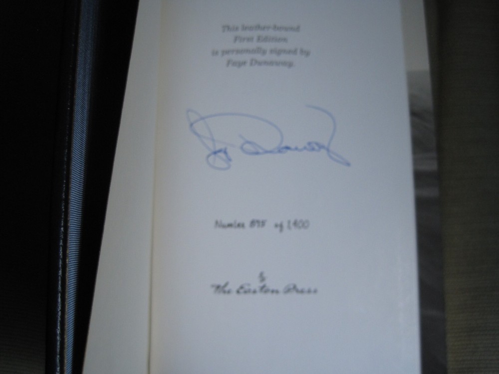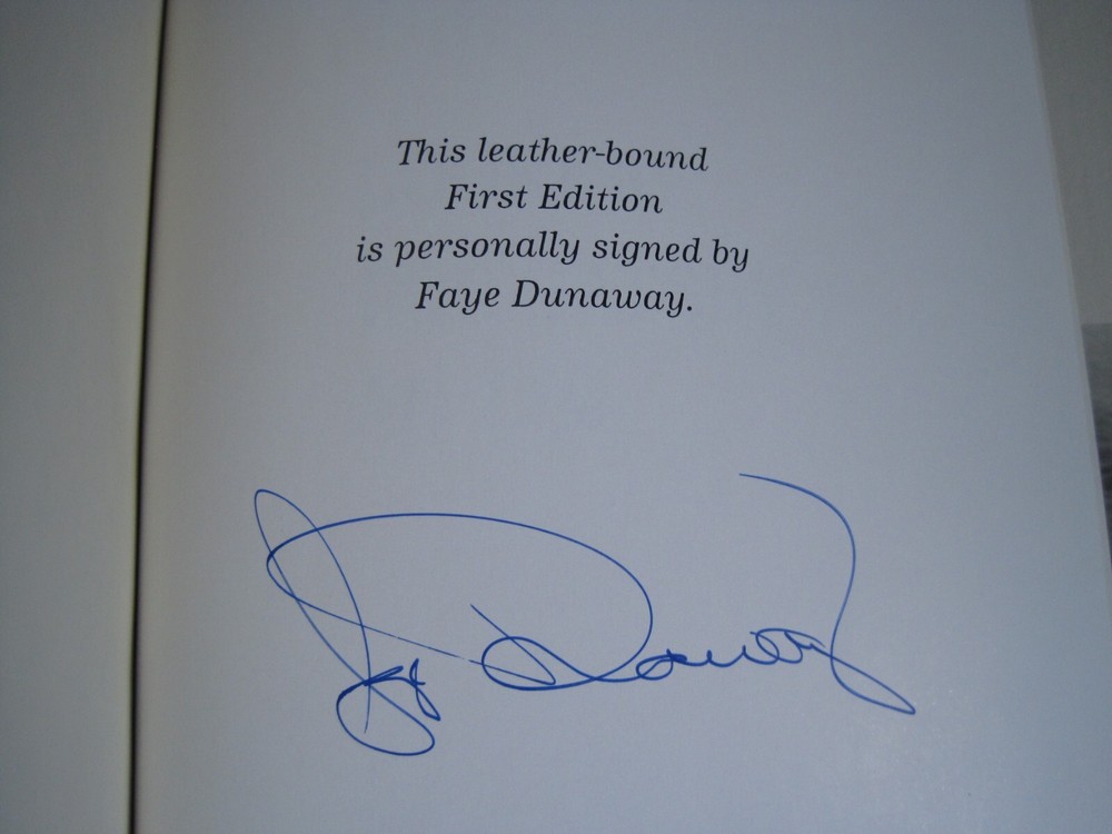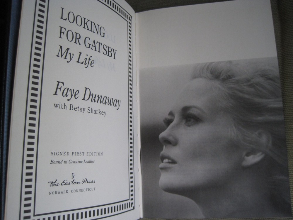 This is a leather bound signed numbered first edition of Faye Dunaway's best-selling memoir - "Looking For Gatsby. My Life", a fascinating book written by the famous Hollywood star and sex-symbol. A very exciting reading, describing both her successful movie career and her dramatic personal life, this is a must have for any movie fan . The book is unread and in great condition, with just minor imperfections of the gold gild on the side of the pages (see images). Signed by the famous Hollywood star on the limitation page, this is book number 895 of only 1400 numbered copies ever printed. Easton Press books are the golden standard in the publishing industry, highly collectible and lasting generations. Easton Press Full Genuine Leather Dubbed Spine Accented Wit 22 kt. Real Gold Satin Ribbon Page Marker Distinctive Cover Design Gilded Page Edges To Protect Against Humidity High Quality Acid - Free paper Smyth-Sewn Pages Silk-Moire Endleaves I combine multiple items for savings on shipping charges. I ship worldwide. Please ask about international shipping charges and/or different shipping options. Please check out my other auctions for several rare signed books for sale. Thank you!