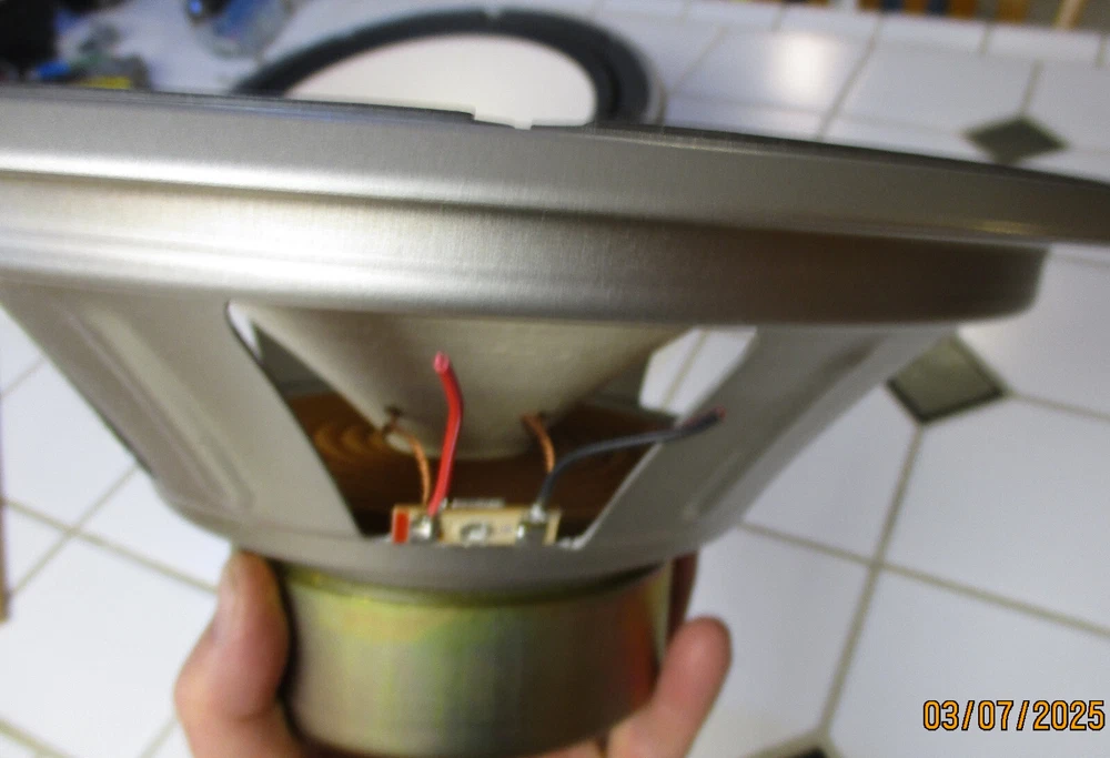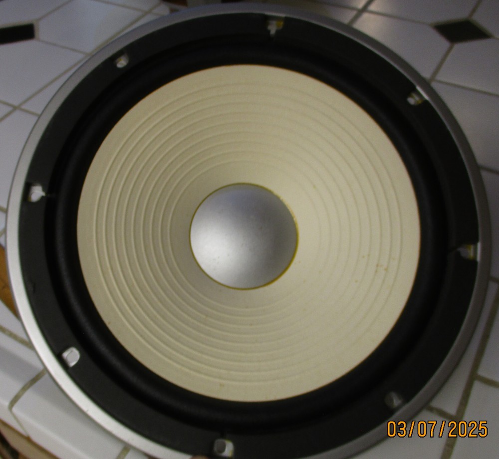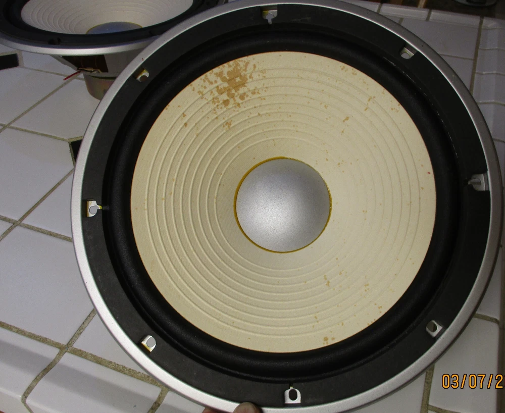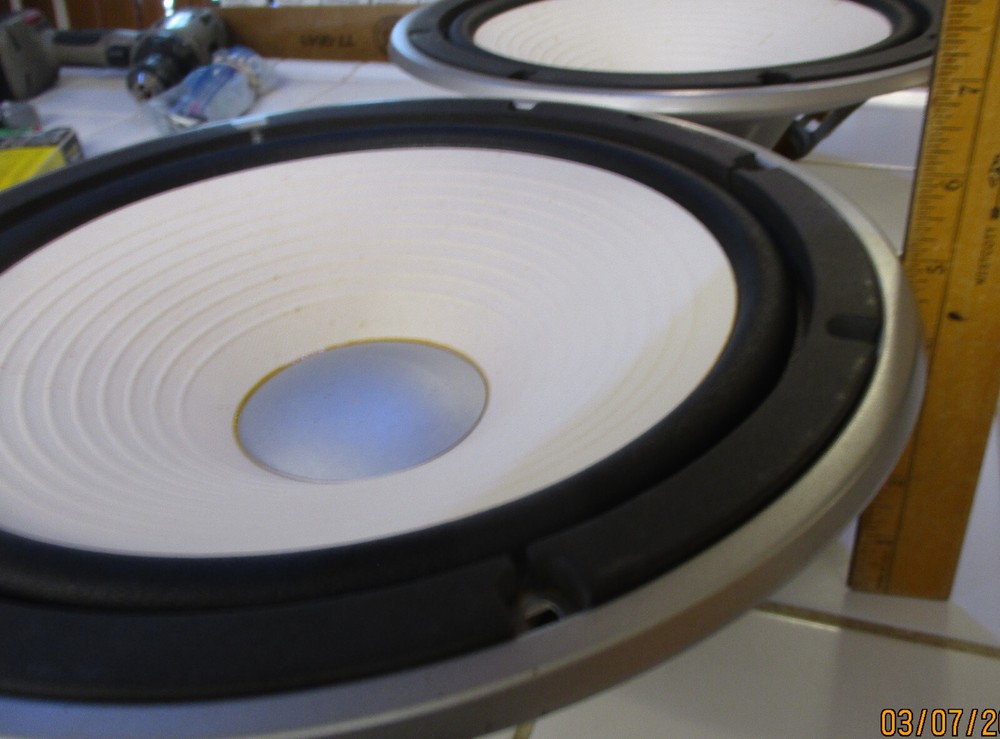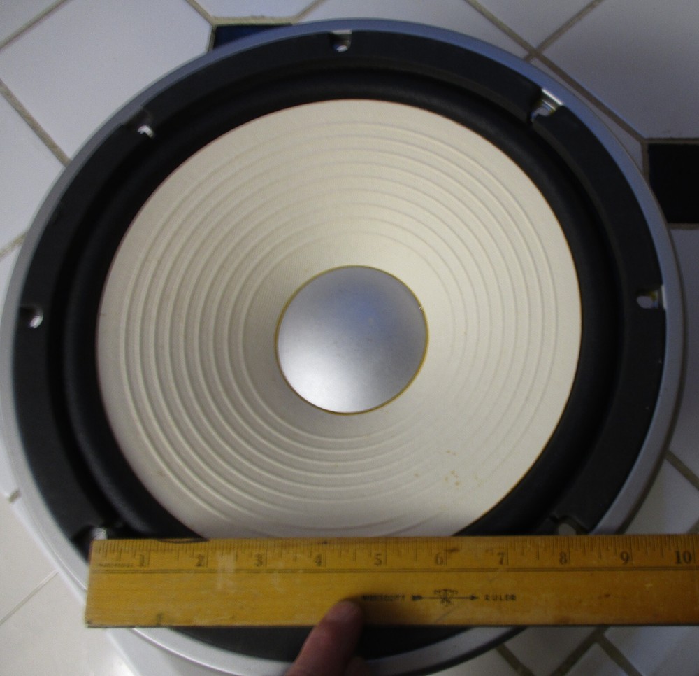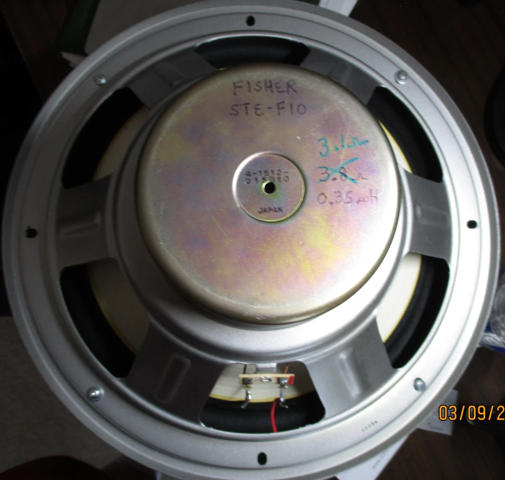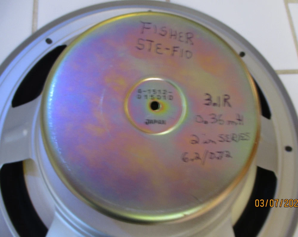 This e B a y Ad is for a pair of nice FISHER Woofers Part # * 4-1512-015010 JAPAN Quite Stylish from early 1990s? Probably 4 or 6 Ohm rated? By this time Fisher brand was made by SANYO, being their Premium line. These have signature "look" a White Pulp cone. One Badge plate included... A review: Series from the STE or "ST Excellent" performing lineup. Why? See the review in AudioKarma "The majority of the STE line of speakers are excellent speakers. Not many of them were sold in the States. They are Fishers' premium line" "Yes, they are SANYO but don't let that fool you. The STEs fly under the radar" Measurements: Very Well matched... Woofer #1 measures at 3.1 ohms, & 0.36uH Woofer #2 measures at 3.1 ohms, & 0.35mH A Pic shows 3.8, upon re-Check measure 3.1 Ohm (an initial Measurement error) Observations: Balanced / equal Low Freq. sound, a nice performance was noticed One has stain in a 3" area, it is not structural, and the cone is intact. The cones, surrounds, & spiders are all fully functional - Ready to Go. Dimensions: 4-3/8" on Octagonal holes, 8" on SQuare holes, 5 " deep 11-3/8" Diagonal (across), fancy integrated style rim ~12.7" Shipping: These to be bolted F2F, wrapped in heavy paper, packed in Zots / styro logs (fluffed starch?), then set in custom-fit padded box. TY for looking - Notice: Ship price already includes Handling of $12. Ships to USA. Basement clear-out. Audio items & Loud Speakers. Selling collections on Downsize. There are other cool Audio, Speakers, and electronics at solar_home eBay page. HISTORY: These were pulled from some nice looking STE-F10 Cabinets a) one Midrange and its cabinet side was damaged (bent in, so tossed) With the rest of this fine 3-Way setup decommissioned. * the 2nd Mid - is big at 6.5" (rare?) with 1" Cu stem, Voice Coil <-- (Wow) * 4-1519-721400 JAPAN A Design is fully capable, tight Alto sound https://www.ebay.com/itm/156754513809 b) a pair of FISHER 4" Horn Tweeters with Bullet nose style - compression diaphragm / dispersion Part# 4-1519 721500 as shown in middle Pics IMHO - These have Plus Strength / Performance https://www.ebay.com/itm/156753023600