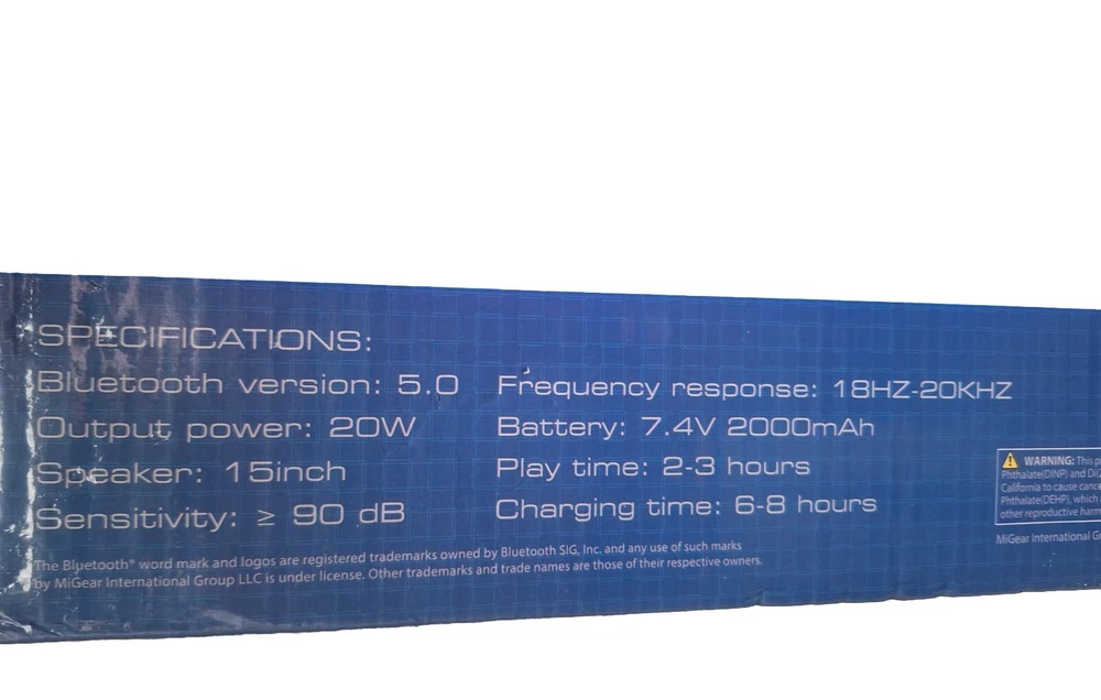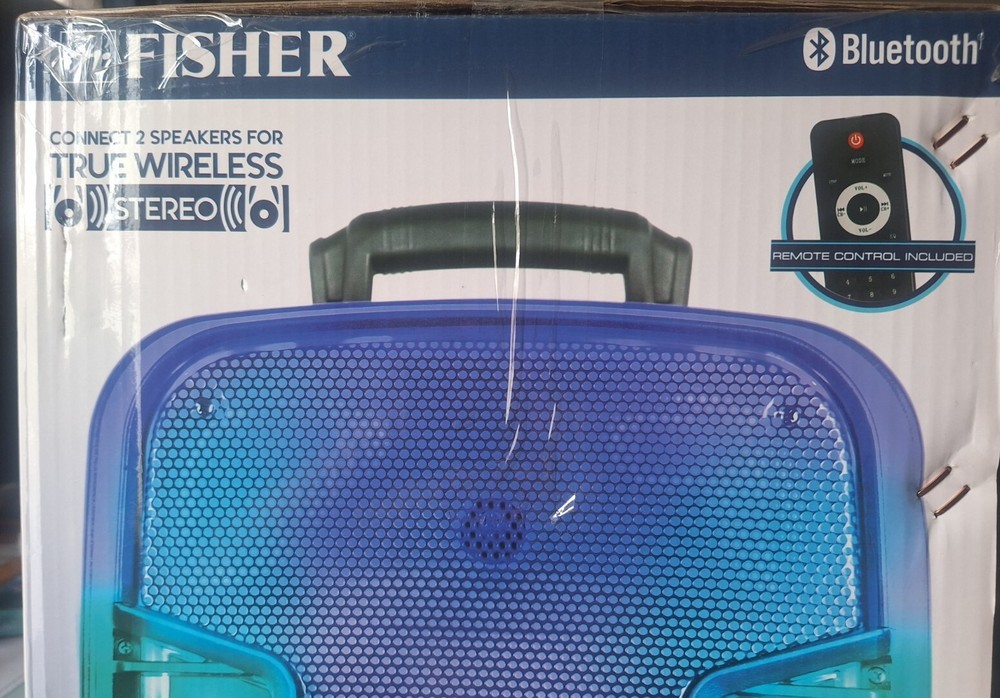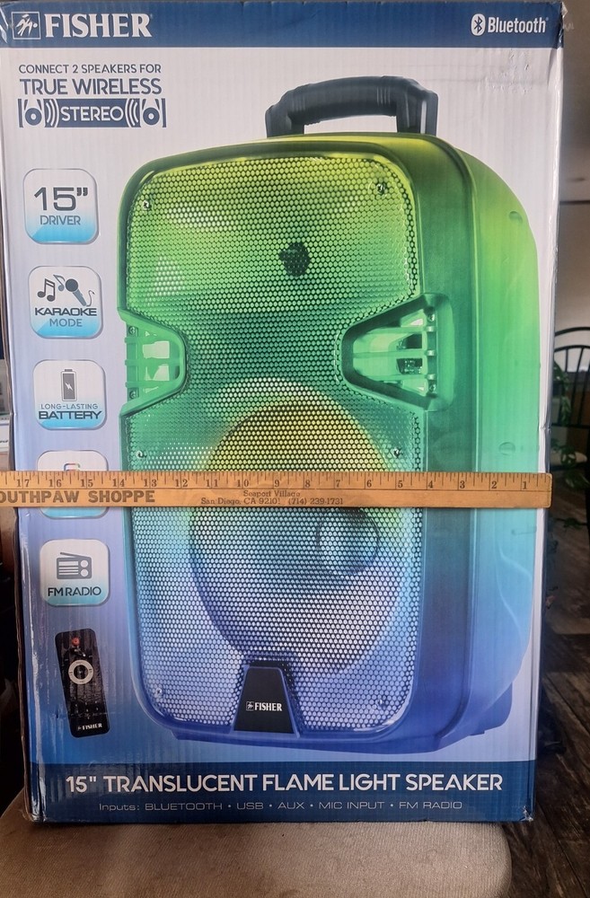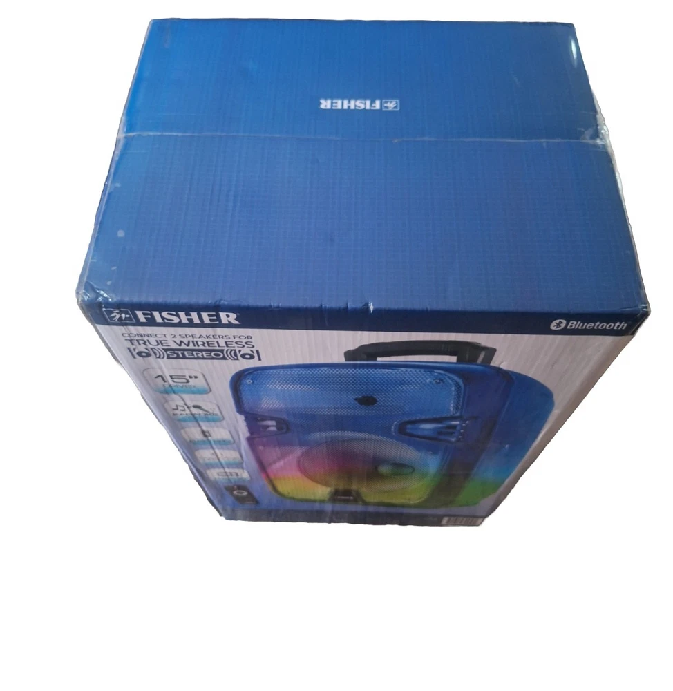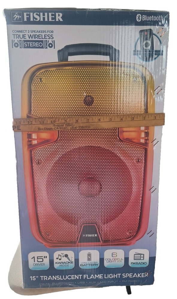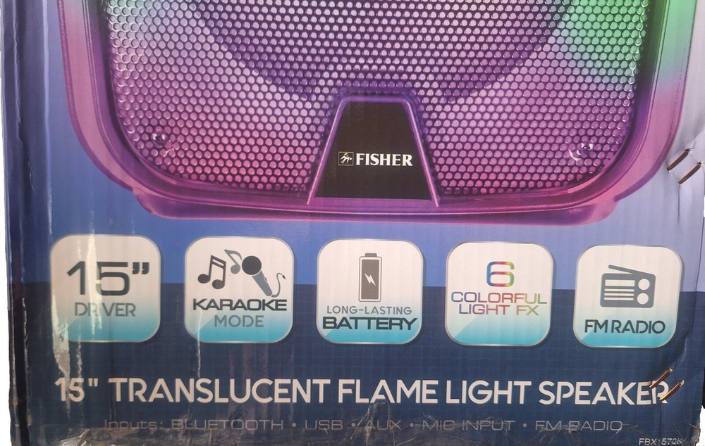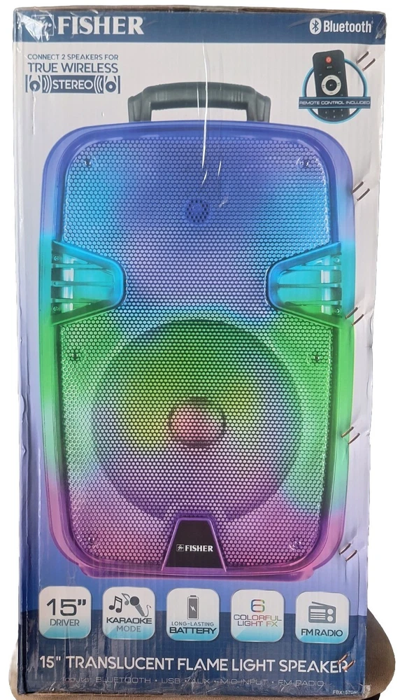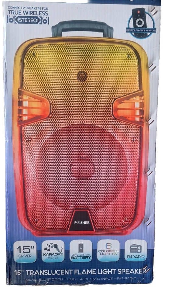 Introducing the FISHER 15" Translucent Flame Light Speaker, perfect for music lovers looking for a unique and versatile speaker. This speaker boasts Bluetooth connectivity, USB, FM radio, and AUX inputs, ensuring you can play your tunes any way you choose. It also features 6 colorful light FX, adding a vibrant touch to your music experience. Made of high-quality plastic, this sleek black speaker has a long-lasting battery capacity and an impressive 20 W RMS power. Its compatibility with universal brands and models makes it a great addition to any audio setup. Get ready to enjoy your favorite music with the FISHER 15" Translucent Flame Light Speaker.