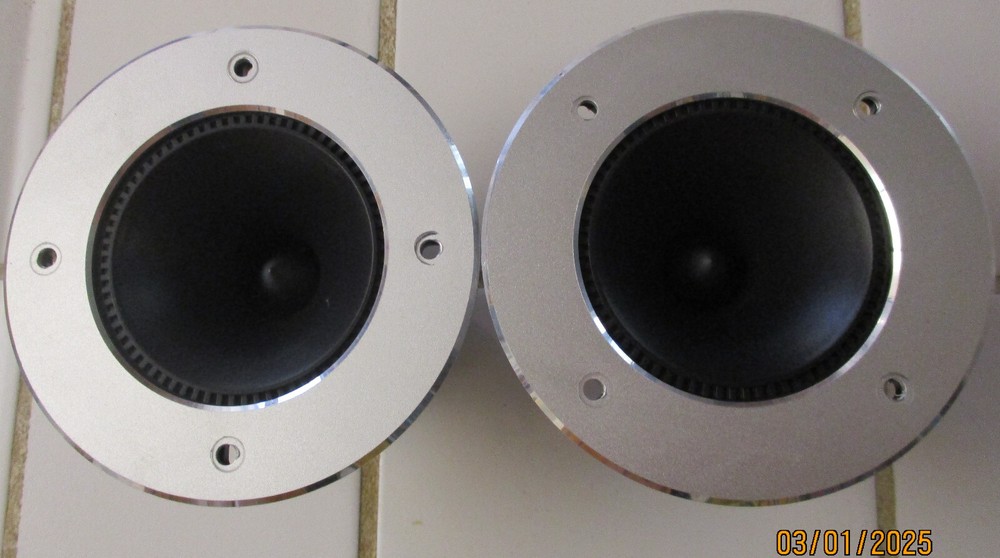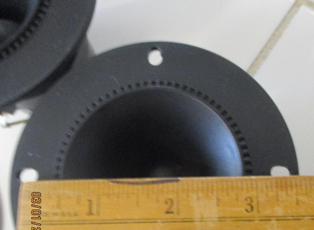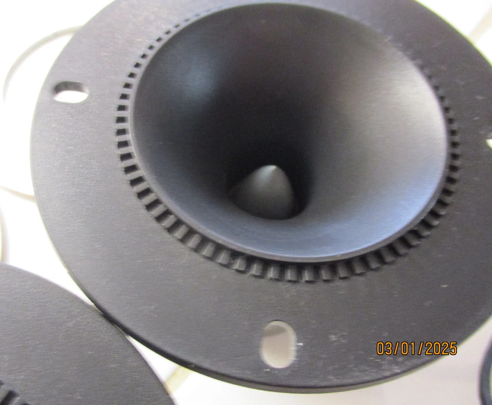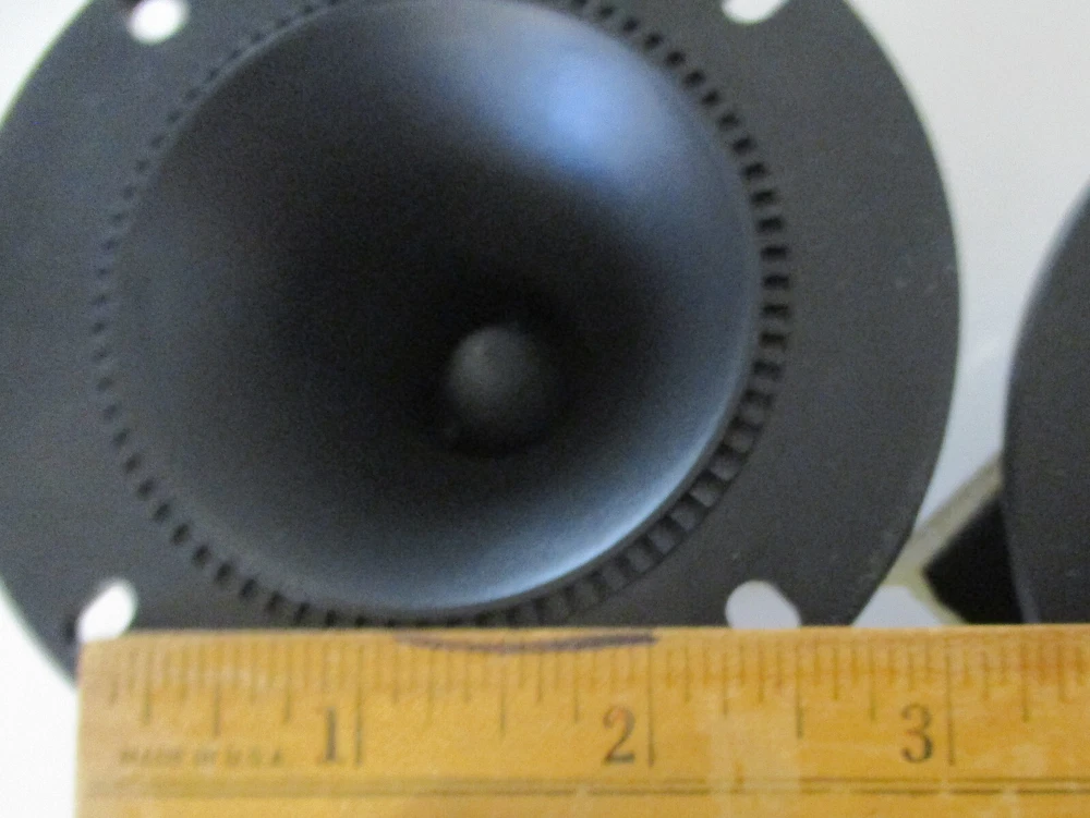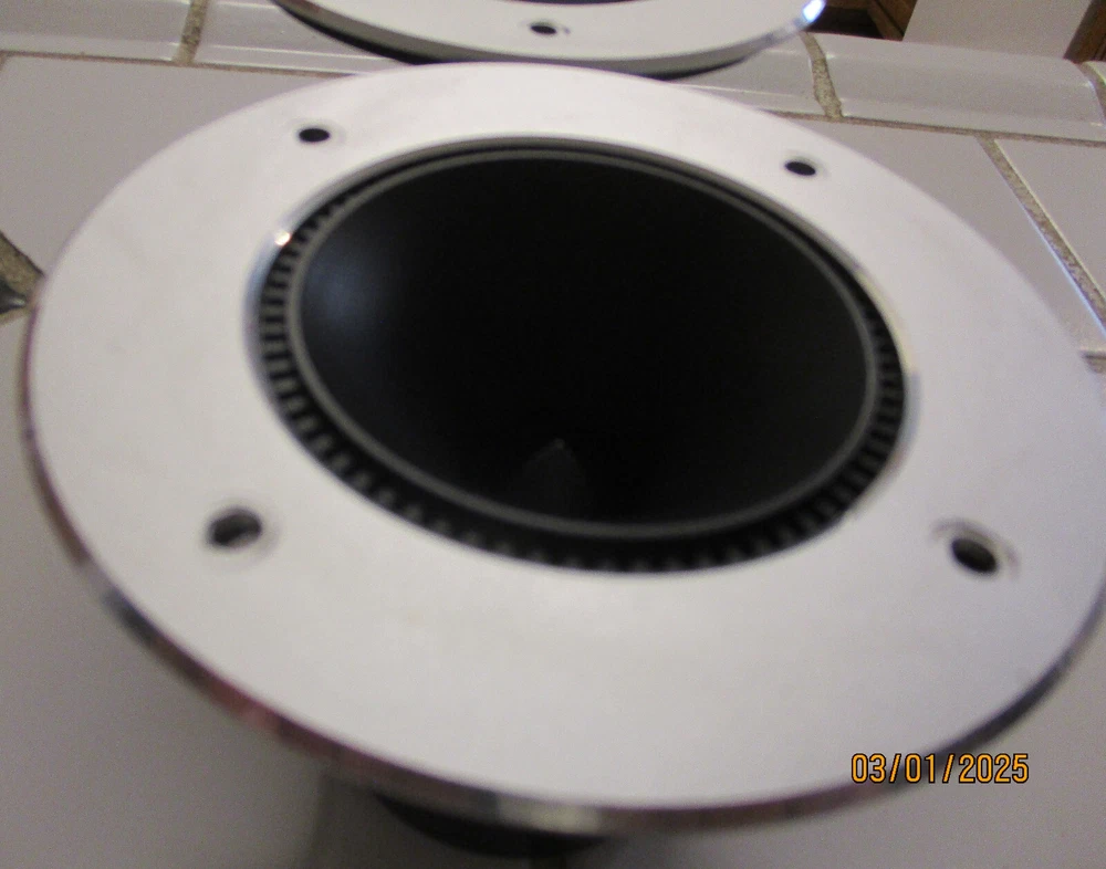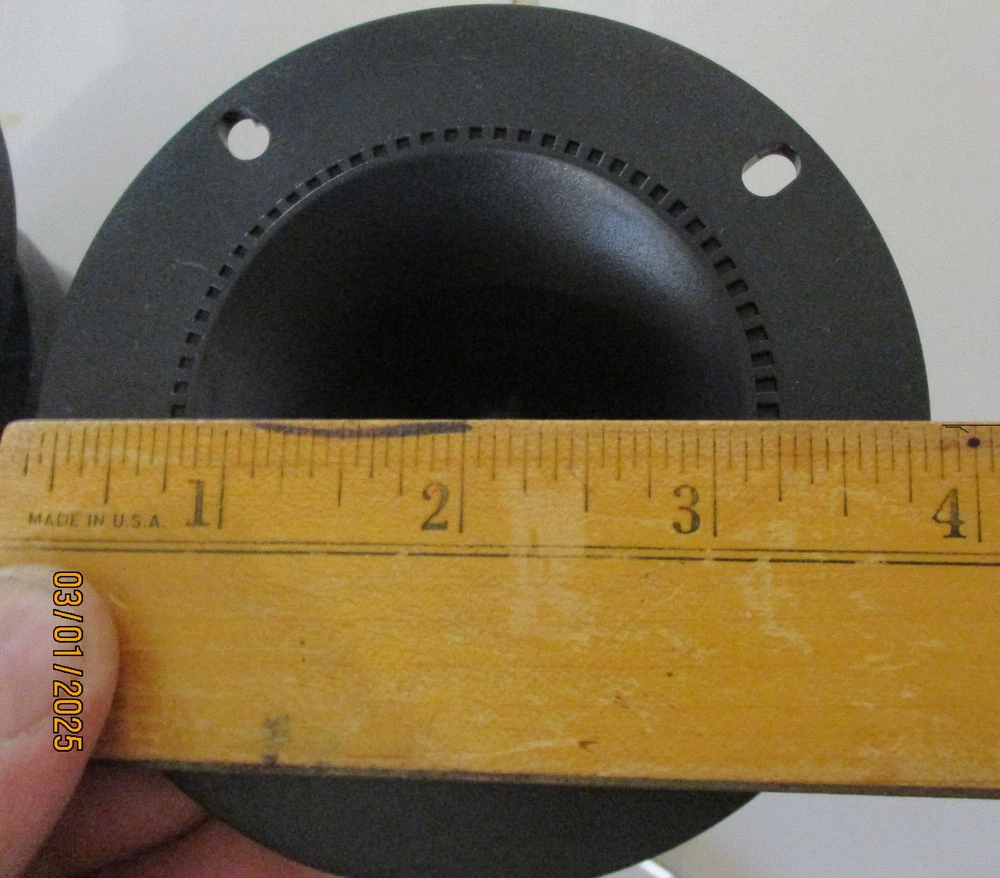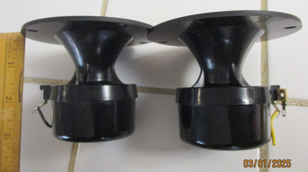 This e B a y Ad is for a pair of FISHER 4" Horn Tweeters 8 Ohm rated with Bullet nose style - compression dispersion Part# 4-1519 721500 as shown in middle Pics NOTE: These puppies have Plus Strength / Performance Useful FISHER refurb or various other 3-Way Speaker Applications. It looks like these are close in the Cerwin Vega sizings they could close fit Cerwin Vegas also, like D-series Ask on just 1 (bit of Premium to break Pair) Measurements: Very Well matched... Tweeter #1 measures at 7.1 ohms, and 315uH Tweeter #2 measures at 7.1 ohms, and 325uH Dimensions: 98mm or 3.9" flange 3.1" deep 2-3/8" for 4 SQuare holes, 3-3/8" across + holes Both produces equal Higher Frequency sounds Shipping: Each small box, packed in Paper, bubble wrap & Zots Both placed in an Outer Box. Should do... HISTORY: These were pulled from a stylish STE-F10 Speaker a) one Midrange and Cabinet side damaged so Parted Out * 2nd Mid - big at 6.5" (rare?) with 1" Cu Stem, Voice Coil * 4-1519-721400 JAPAN https://www.ebay.com/itm/156754513809 b) Woofers and Strong (1.5" VC, White-Pulp cone) see in Ad https://www.ebay.com/itm/156782251535 * 4-1512-015010 JAPAN TY for looking - Notice: Ship price already includes Handling of $5. Ships to USA. Basement clear-out. Audio items & Loud Speakers. Selling collections on Downsize. There are other cool Audio, Speakers, and electronics at solar_home eBay page.
