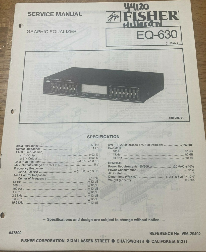 This is for an original FISHER service MANUAL, includes REPAIR INFO, part numbers and SCHEMATIC DIAGRAMS MODEL - EQ-630 GRAPHIC EQUALIZER VERY GOOD CONDITION, Doesn't look like it was ever used. WE HAVE NO STEREO UNITS, OR AMPLIFIERS LEFT!!! THESE ARE ALL THE FISHER MANUALS WE HAVE LEFT. IF YOU DON'T SEE IT i DON'T HAVE IT. We closed out our electronic Service Shop a few years ago and are selling off the manuals we have left, some of which are manuals we acquired from other service centers that have closed.. Please check our other auctions for other closeout clearance items. I will be listing them as quick as I can but will probably take several months to list everything we have left. Item will be shipped in an envelope. Shipping is FREE in the 48 States only. $14.02 I nternational shipping. PLEASE check our other auctions. We Give free shipping in the U.S. for each additional manual purchased. Item will be shipped USPS economic shipping and may take 1-9 days. If you want faster shipping please let me know. ITEM IS SOLD "AS IS"! Thank You for the bid, and GOD BLESS THE U.S.A .