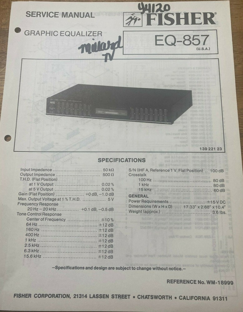 This is for an original FISHER service MANUAL, includes REPAIR INFO, part numbers and SCHEMATIC DIAGRAMS MODEL - EQ-857 GRAPHIC EQUALIZER VERY GOOD CONDITION, Doesn't look like it was ever used. WE HAVE NO STEREO UNITS, OR AMPLIFIERS LEFT!!! THESE ARE ALL THE FISHER MANUALS WE HAVE LEFT. IF YOU DON'T SEE IT i DON'T HAVE IT. We closed out our electronic Service Shop a few years ago and are selling off the manuals we have left, some of which are manuals we acquired from other service centers that have closed.. Please check our other auctions for other closeout clearance items. I will be listing them as quick as I can but will probably take several months to list everything we have left. Item will be shipped in an envelope. Shipping is FREE in the 48 States only. $14.02 I nternational shipping. PLEASE check our other auctions. We Give free shipping in the U.S. for each additional manual purchased. Item will be shipped USPS economic shipping and may take 1-9 days. If you want faster shipping please let me know. ITEM IS SOLD "AS IS"! Thank You for the bid, and GOD BLESS THE U.S.A .
